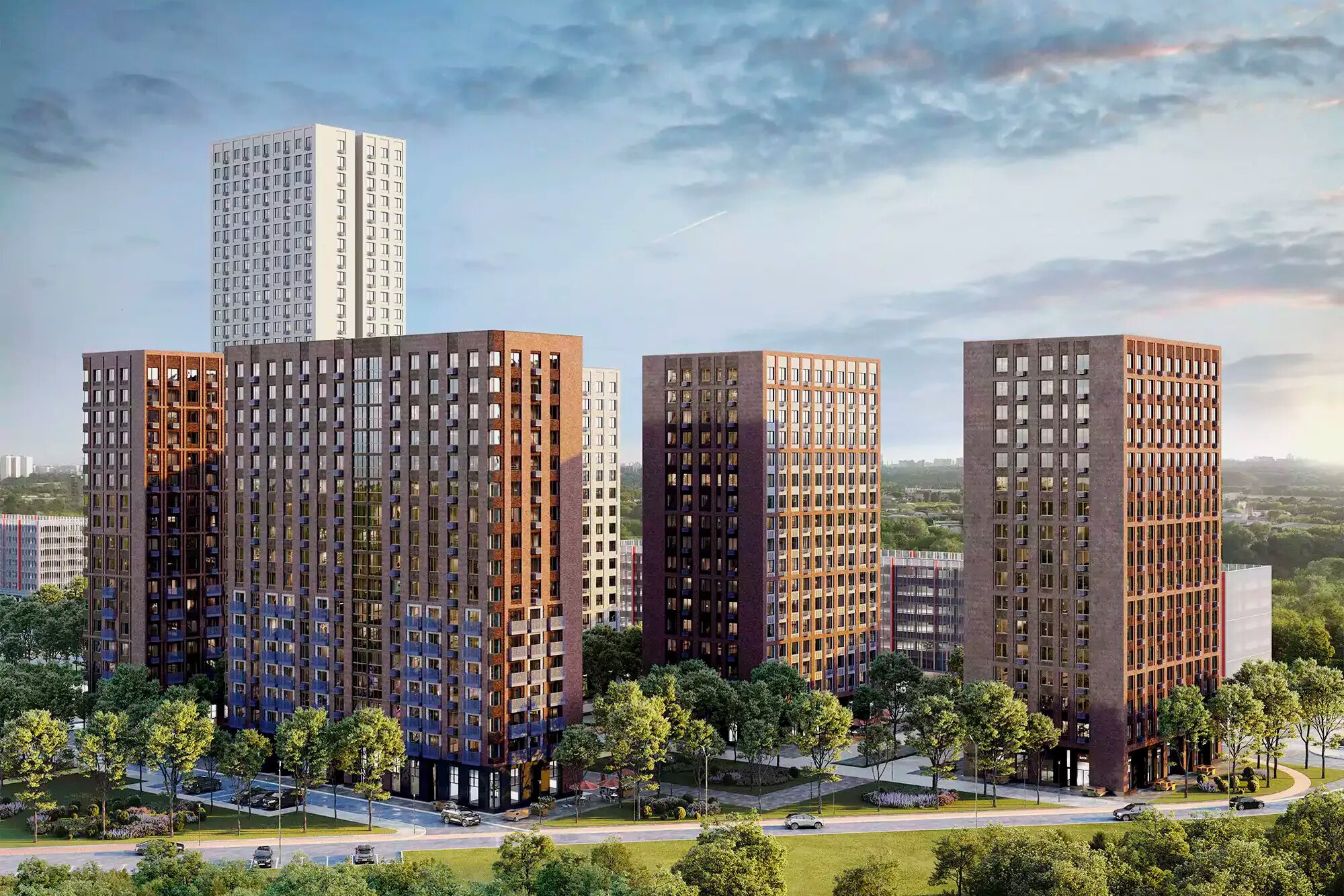 Дворы. Благоустроенные дворы корпусов будут закрыты для въезда транспорта. Дома оборудуют системой круглосуточного видеоконтроля, управлять доступом в подъезды жильцы смогут с помощью домофона. На придомовой территории высадят деревья и кустарники, разобьют газоны и цветники.