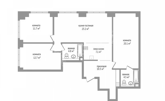 В санузлах сделают натяжные потолки, уложат керамогранитную плитку, установят душевую кабину или ванну из искусственного камня, подвесной унитаз. Также в санузлах будут сделаны тёплые полы. В прихожей установят видеодомофон.