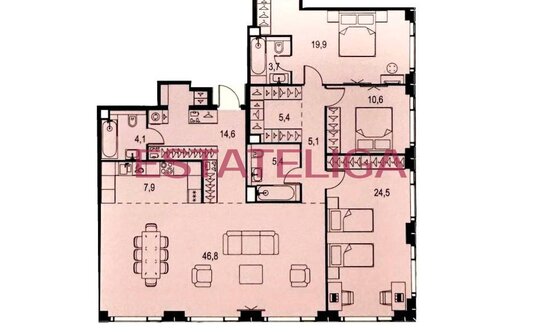 Верхние этажи зданий будут отданы под пентхаусы с панорамным остеклением и потолками высотой от 3,9 до 6,3 м. Там будут располагаться пяти-, шести-, семи- и восьмикомнатные двухуровневые квартиры. Также можно будет выбрать квартиры с панорамными окнами, выходящими на три стороны света.