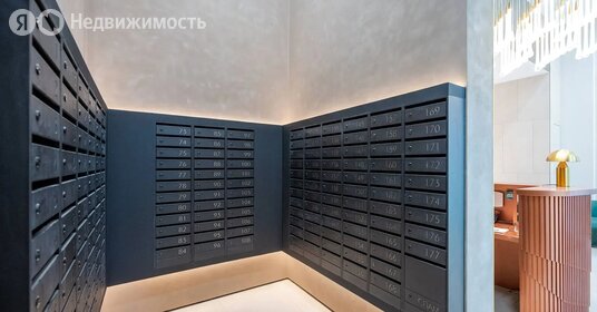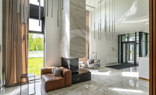 Входные группы расположены во дворах. На первых этажах есть просторные лобби с мраморным полом и деревянными деталями, которые перекликаются с внешней отделкой зданий. Благодаря панорамному остеклению и высоким потолкам (5,7 м) в помещениях всегда светло. В холле находятся стойка консьержа, лаундж-зона с мягкой мебелью и даже собственная библиотека с электрическим камином. Также здесь есть гостевые санузлы и споты для мойки лап питомцев.
