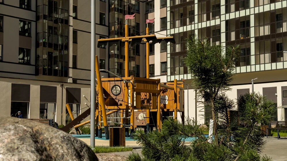 Дворы. Во дворах высажено более 200 деревьев (берёзы и горные сосны) и 2000 кустарников. Ландшафтные дизайнеры, вдохновлённые пейзажами Карелии и побережья Финского залива, применили особый вид садовой архитектуры — геопластику: за счёт плавного изменения уровня высоты воссоздаётся естественный рельеф земли, с холмами и пригорками.