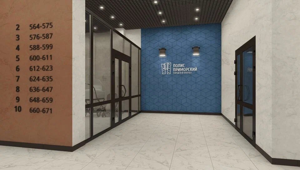 Входные группы. На всей территории жилого комплекса — безбарьерная среда, вход в парадные находится на уровне земли. Просторные холлы выполнены по авторскому проекту, с отделкой керамогранитом под мрамор и тёмно-синими, морскими акцентами. В парадных установлены грузопассажирские лифты фирмы OTIS с зеркалами в пол. В противоположной от лифтов стороне за прозрачными дверями оборудовано пространство для хранения колясок.