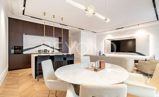 Высота потолков 3,3 м на этажах со второго по шестой, на седьмом этаже видовые квартиры с террасами имеют высоту потолков 4 метра.