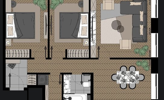Большое внимание в проекте уделено естественному освещению в апартаментах — во всех будут панорамные окна. А двойные стеклопакеты Guardian Climaguard Solar позволят экономить на обогреве помещений зимой и не перегреваться летом.