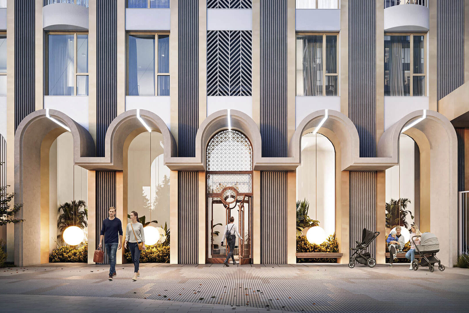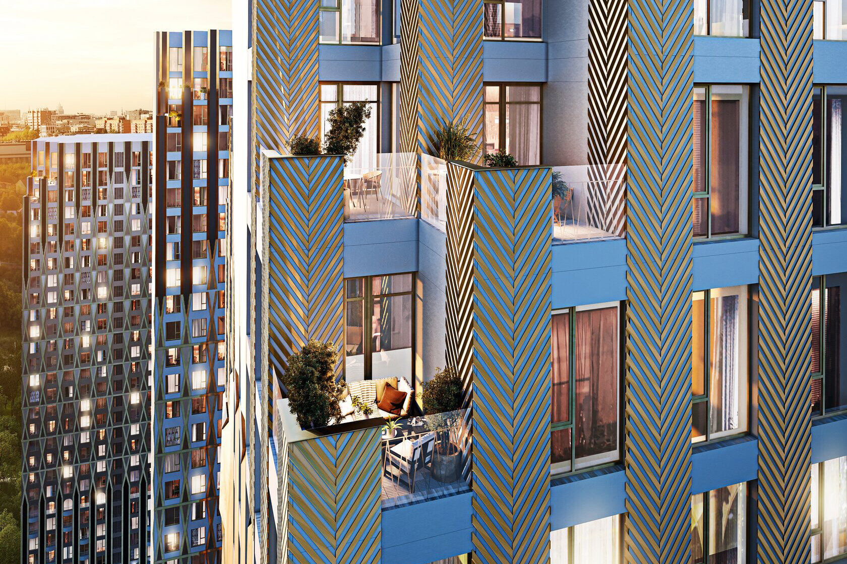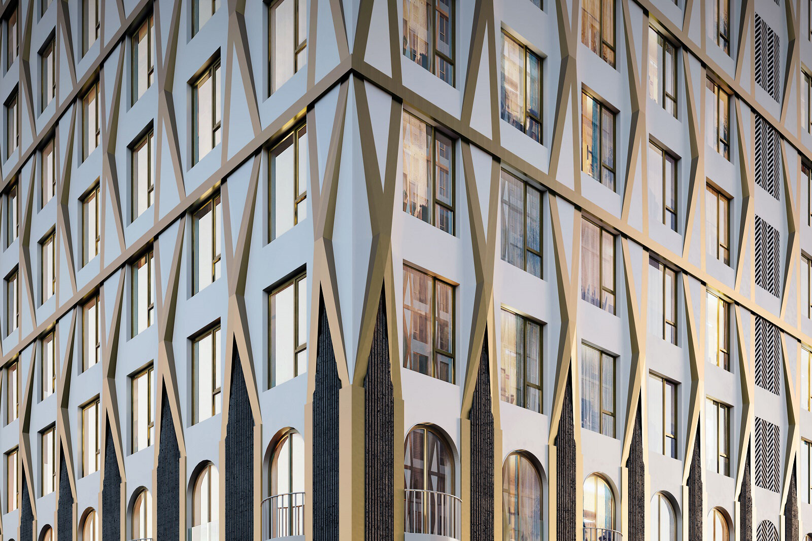 Застройщик использует премиальные строительные материалы. До пятого этажа фасады будут отделаны натуральным камнем и украшены орнаментальными декоративными элементами. Входные группы украсят арочные козырьки с подсветкой, окна — декоративные кружевные решётки из металла. Интерьеры входных групп будут выполнены из камня тёплых светлых оттенков: натурального мрамора и травертина. Стиль и интерьеры лобби разработаны дизайнерским бюро HAAST.