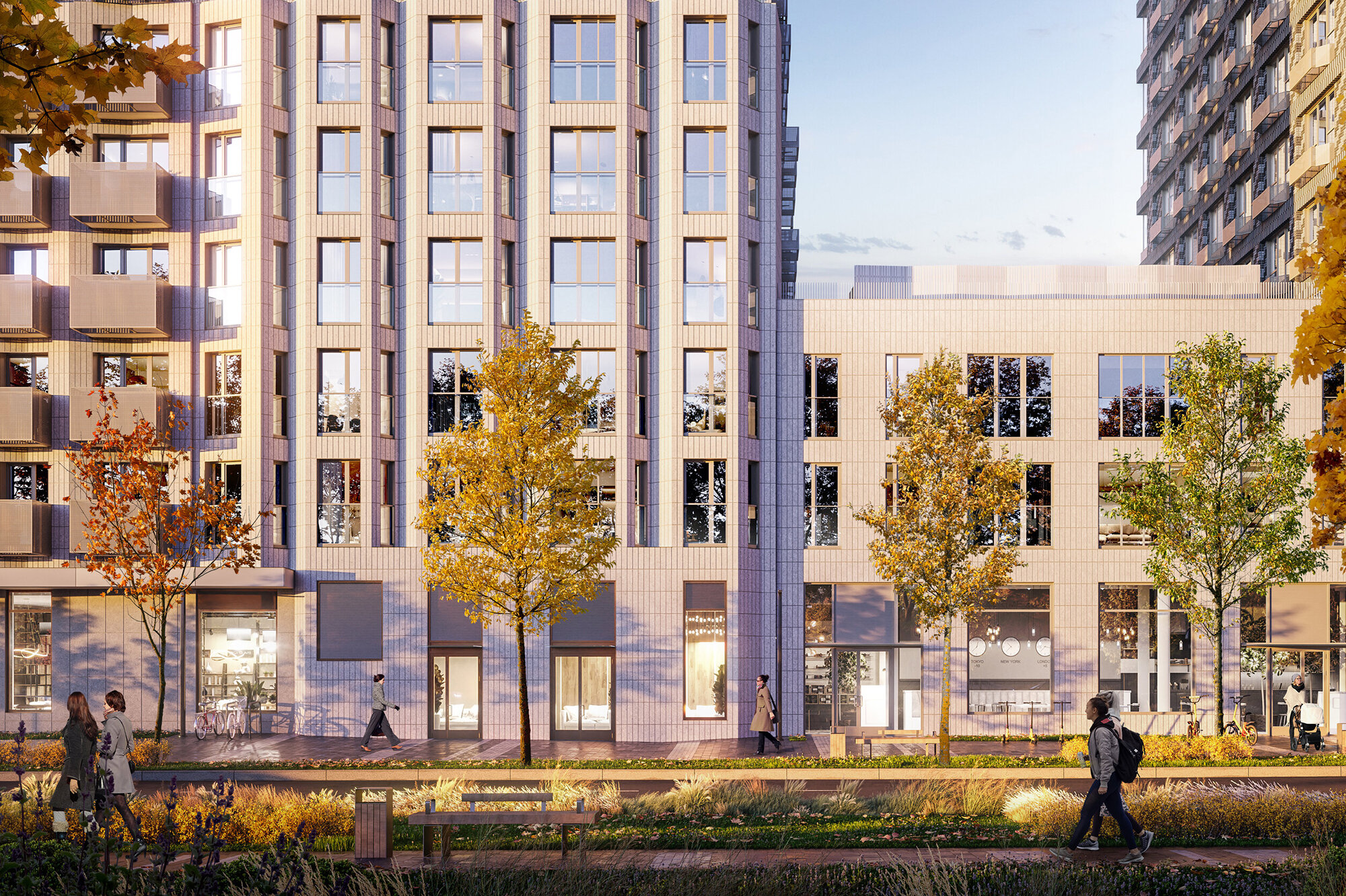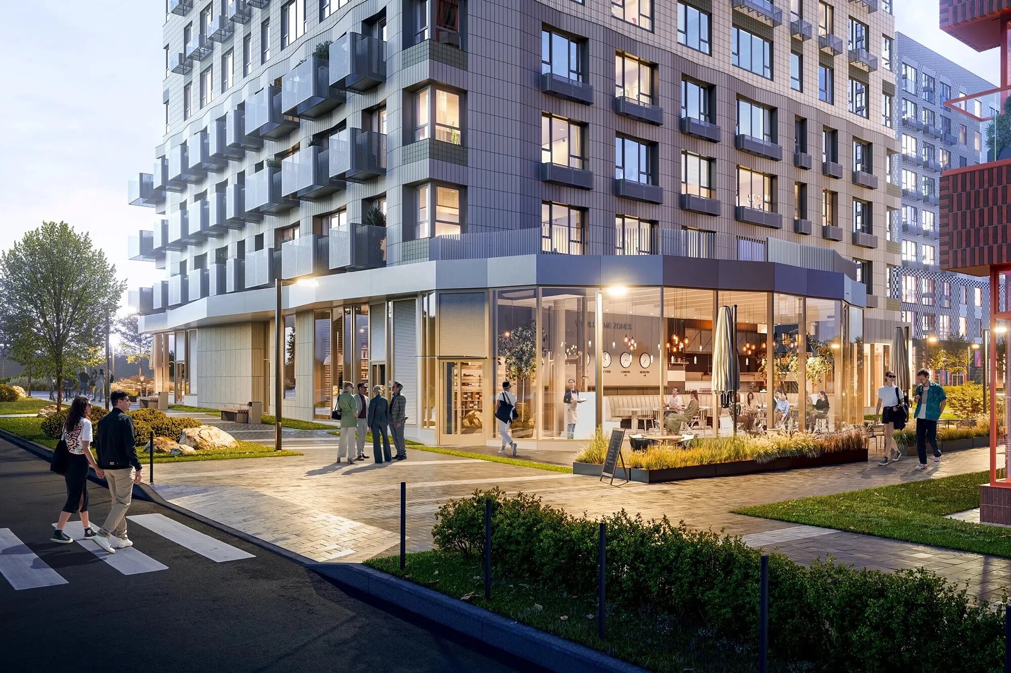 Покупки и отдых. На первых этажах домов откроются магазины, кафе, пекарни, пункты выдачи заказов из маркетплейсов, салоны красоты и другие сервисы.