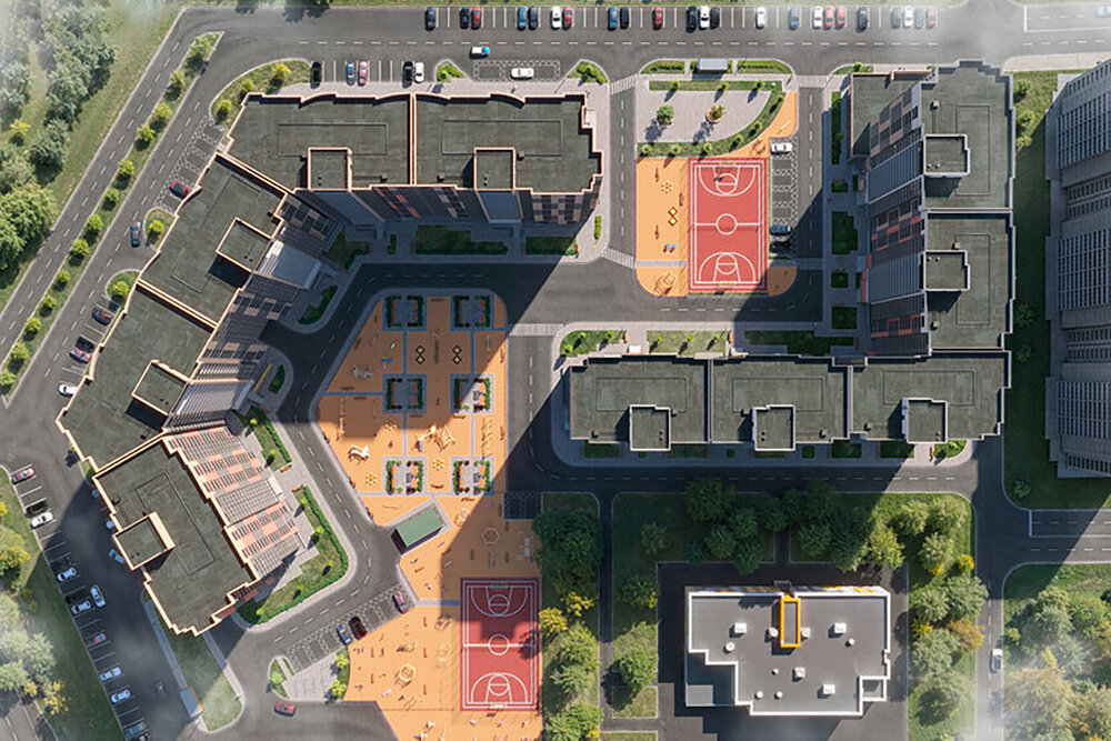 Двор. Во дворе оборудуют зоны для игр, спортивные площадки, места для тихого спокойного отдыха. Двор не будет полностью закрыт от машин, застройщик планирует оставить проезд к подъездам во дворе и гостевые парковочные места.