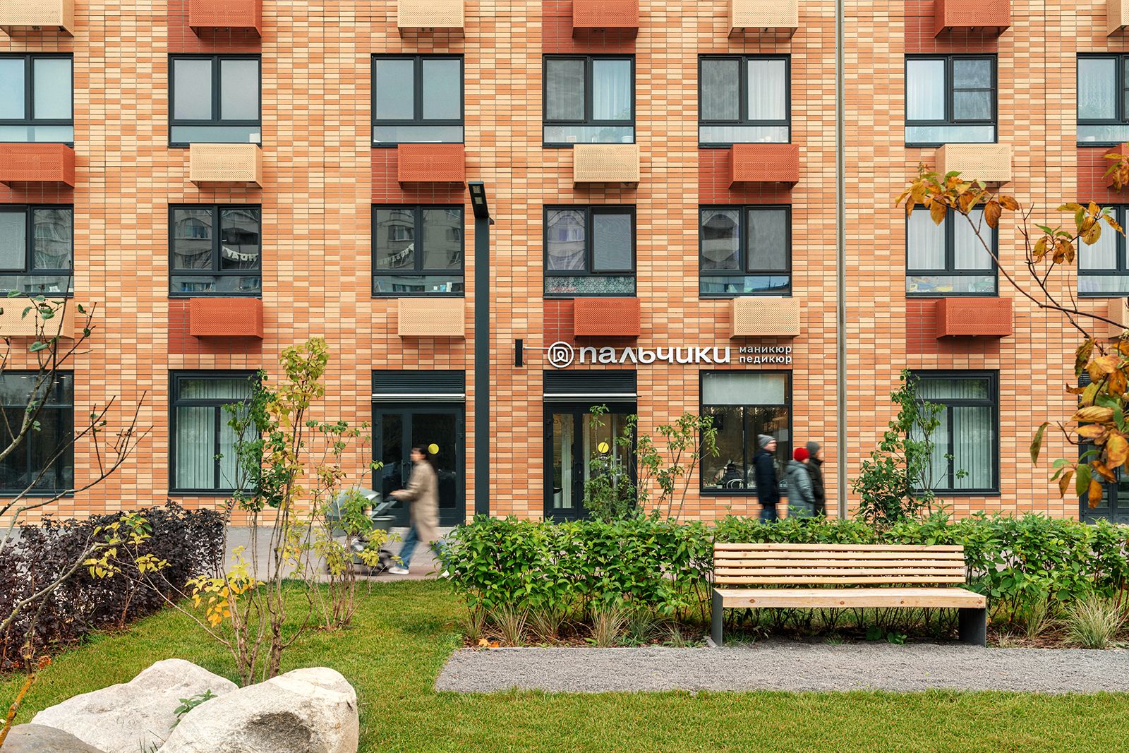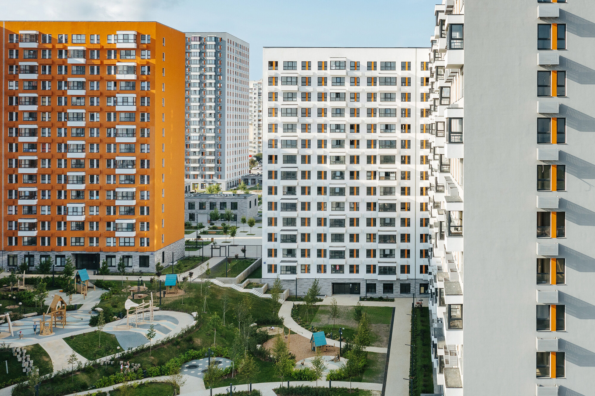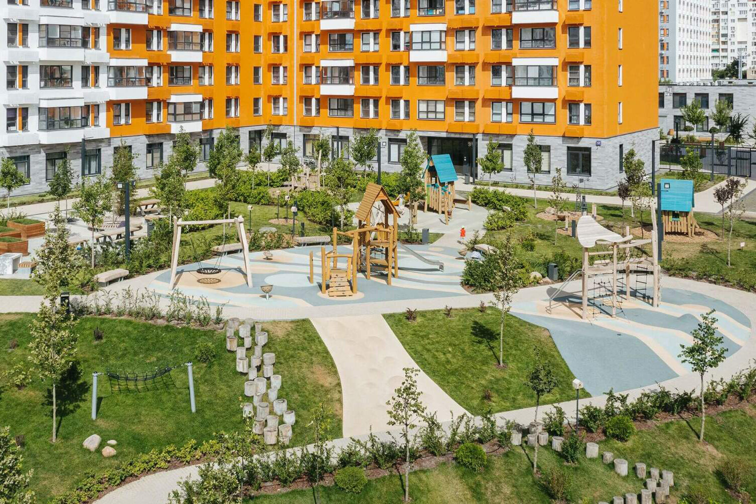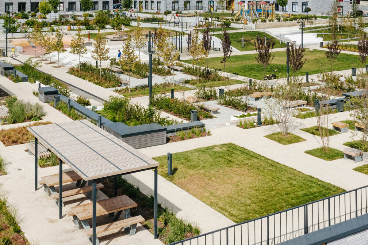 Дворы. Дворы в ЖК обустроены в соответствии с концепцией многоуровневого ландшафта: здесь естественные неровности превращены в амфитеатры и террасы, где расположены зоны отдыха, детские площадки, парковая мебель и навесы. В центральной части комплекса –– прогулочный бульвар.