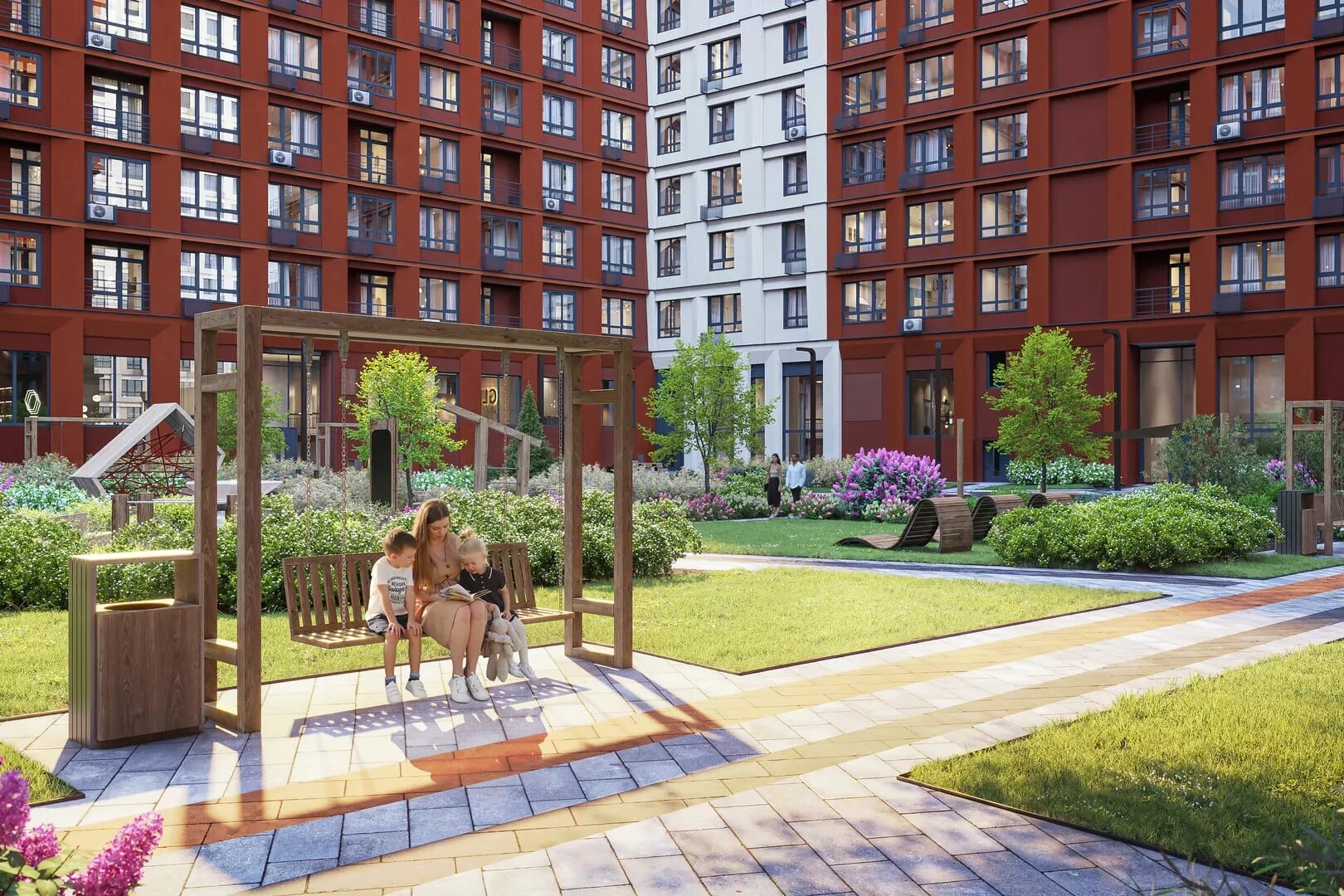 Двор. Корпуса ЖК образуют закрытые внутренние дворы, свободные от автомобильного движения. Доступ на их территорию будет контролироваться. Все дворы благоустроят, озеленят и разобьют на функциональные зоны — пешеходные дорожки, пространства для спокойного и активного отдыха, занятий спортом и игр с детьми.