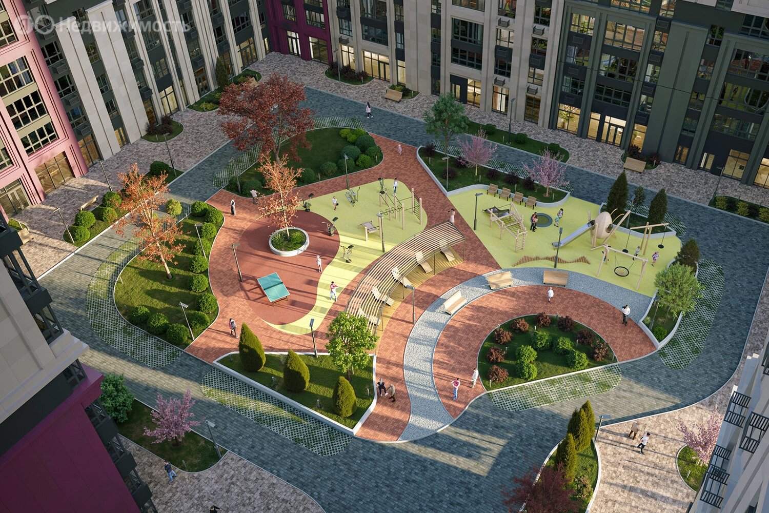 Двор. Застройка ведётся кварталами, в каждом из них будет свой приватный двор с детскими площадками, воркаут-зонами и местами для спокойного отдыха. Запланированы скалодром, батуты и верёвочный парк, а также бульвар для прогулок, парк с арт-объектами и уличный кинотеатр. Ландшафтное озеленение будет выполнено таким образом, чтобы дворы выглядели привлекательно круглый год.Территория будет закрыта от посторонних, предусмотрены охрана и круглосуточное наблюдение.