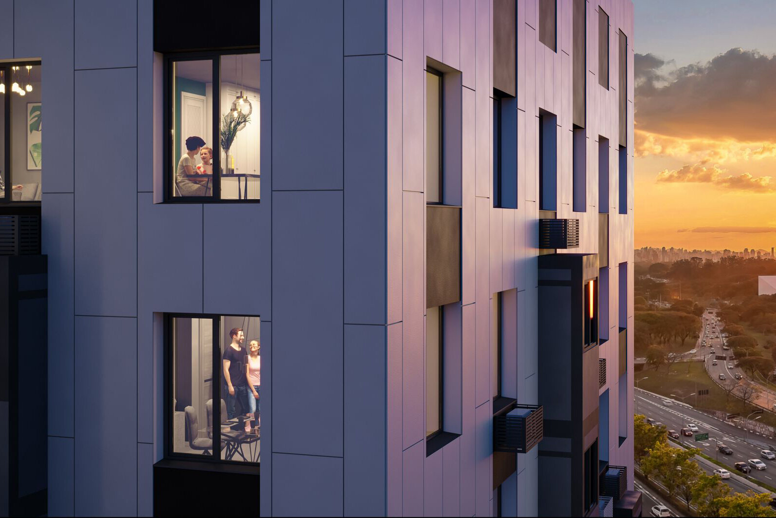 Балконы имеют панорамное остекление, при этом их нижняя часть выполнена из затемнённого стекла. В вечернее и ночное время фасады будут подсвечиваться мягким светом, который подчеркнёт силуэты зданий.