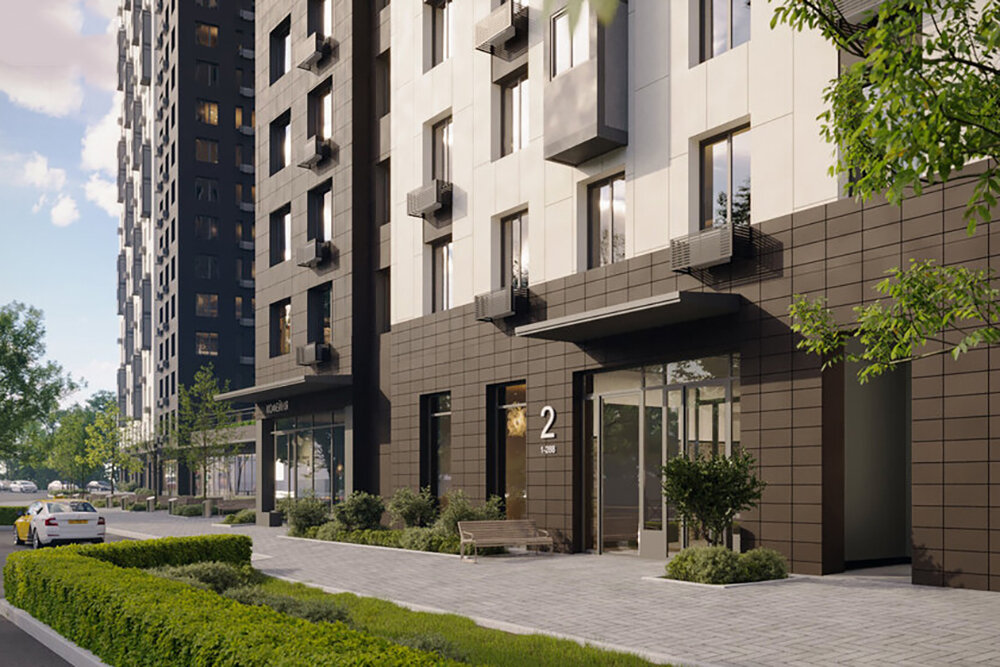 Балконы и корзины для кондиционеров окрашены в цвет фасадов, это обеспечивает целостность восприятия комплекса. Отделка нижних этажей — из терракотовых панелей, верхние уровни облицованы крупноформатными фиброцементными панелями.