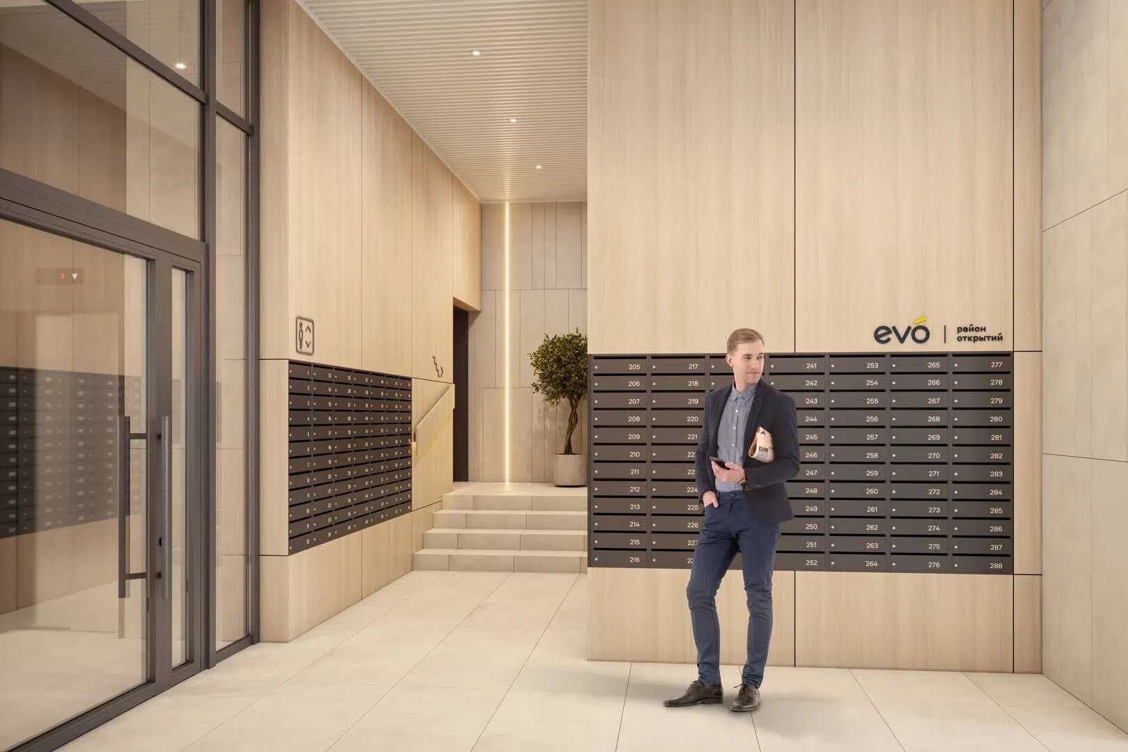 Входные группы. Входные группы ЖК EVO имеют витражное остекление и потолки высотой более четырёх метров, что создаёт светлое и открытое пространство.