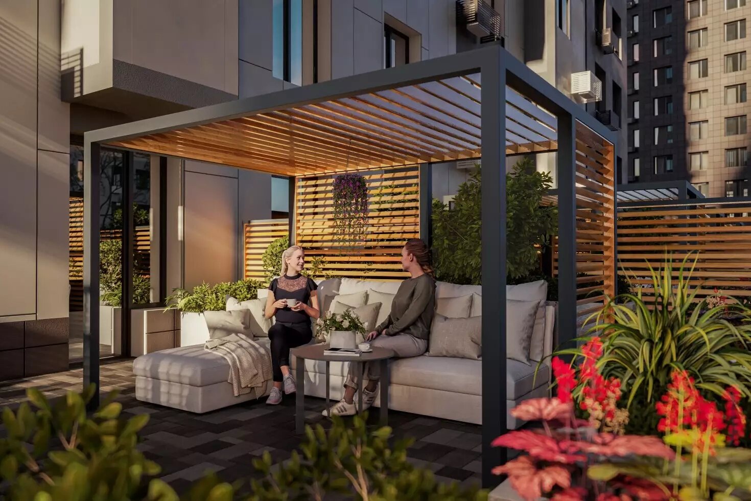 В комплексе есть квартиры с балконами и собственными террасами, двумя санузлами и гардеробными.