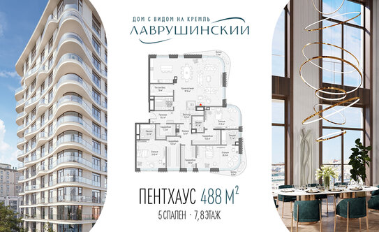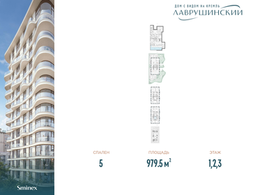 В «Лаврушинском» можно купить квартиры с одной, двумя, тремя, четырьмя и пятью комнатами площадью от 65 до 471 кв. м. Всего в комплексе представлено 109 планировок, среди них есть варианты с эркерами, панорамными и моллированными (полукруглыми) окнами, террасами и балконами.