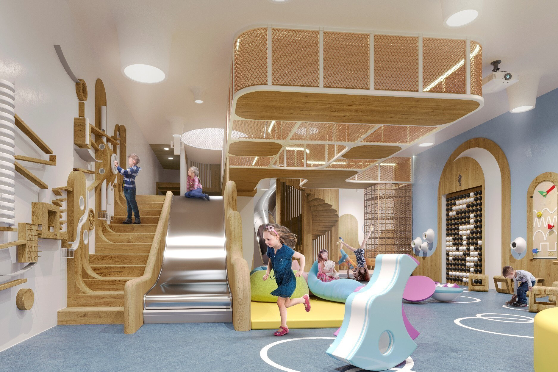 Для детей. Во дворе запланирована детская площадка, а в одном из корпусов — игровая комната с подвесным лабиринтом, проектором, зоной для творчества и сухим бассейном.