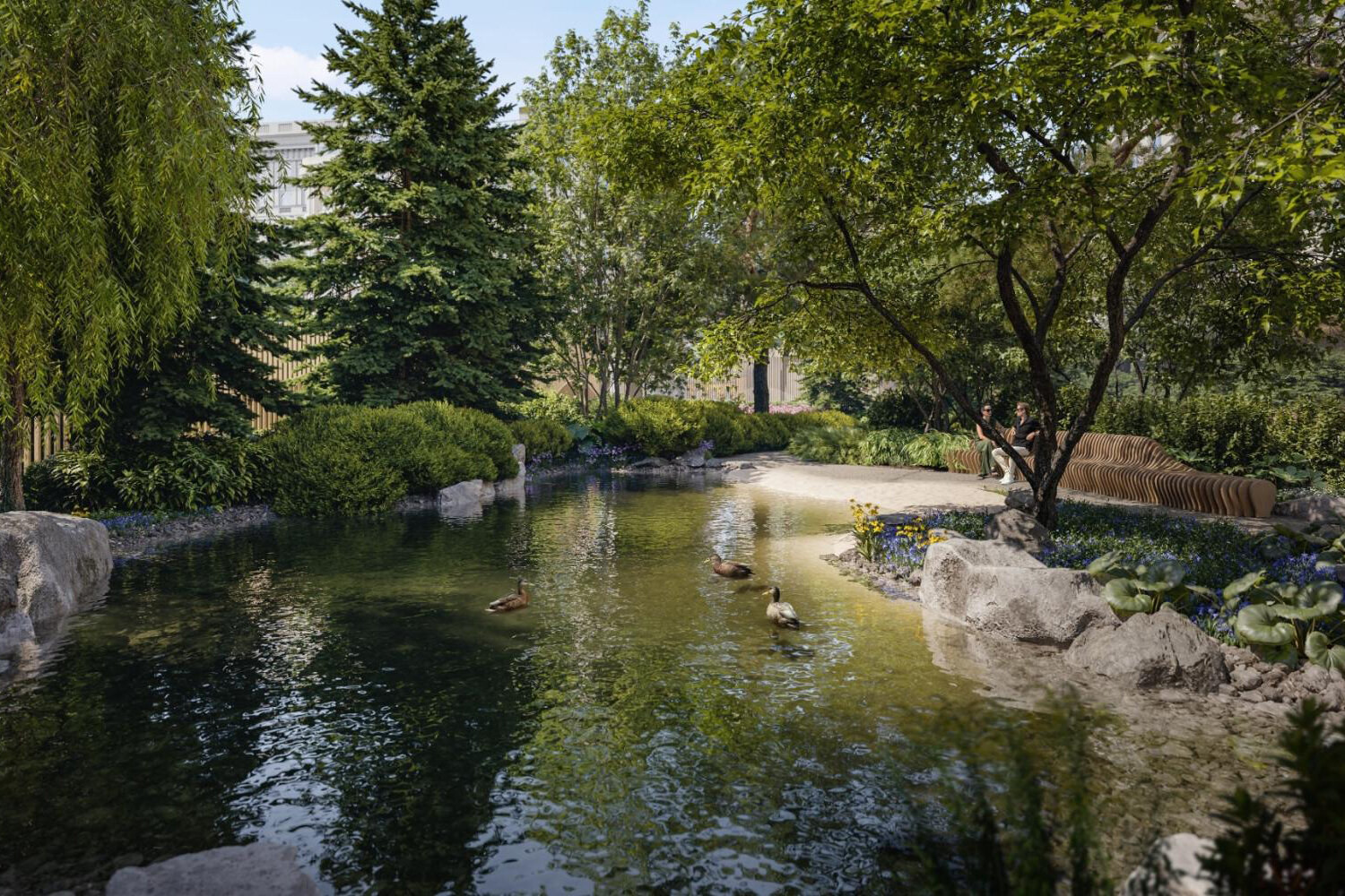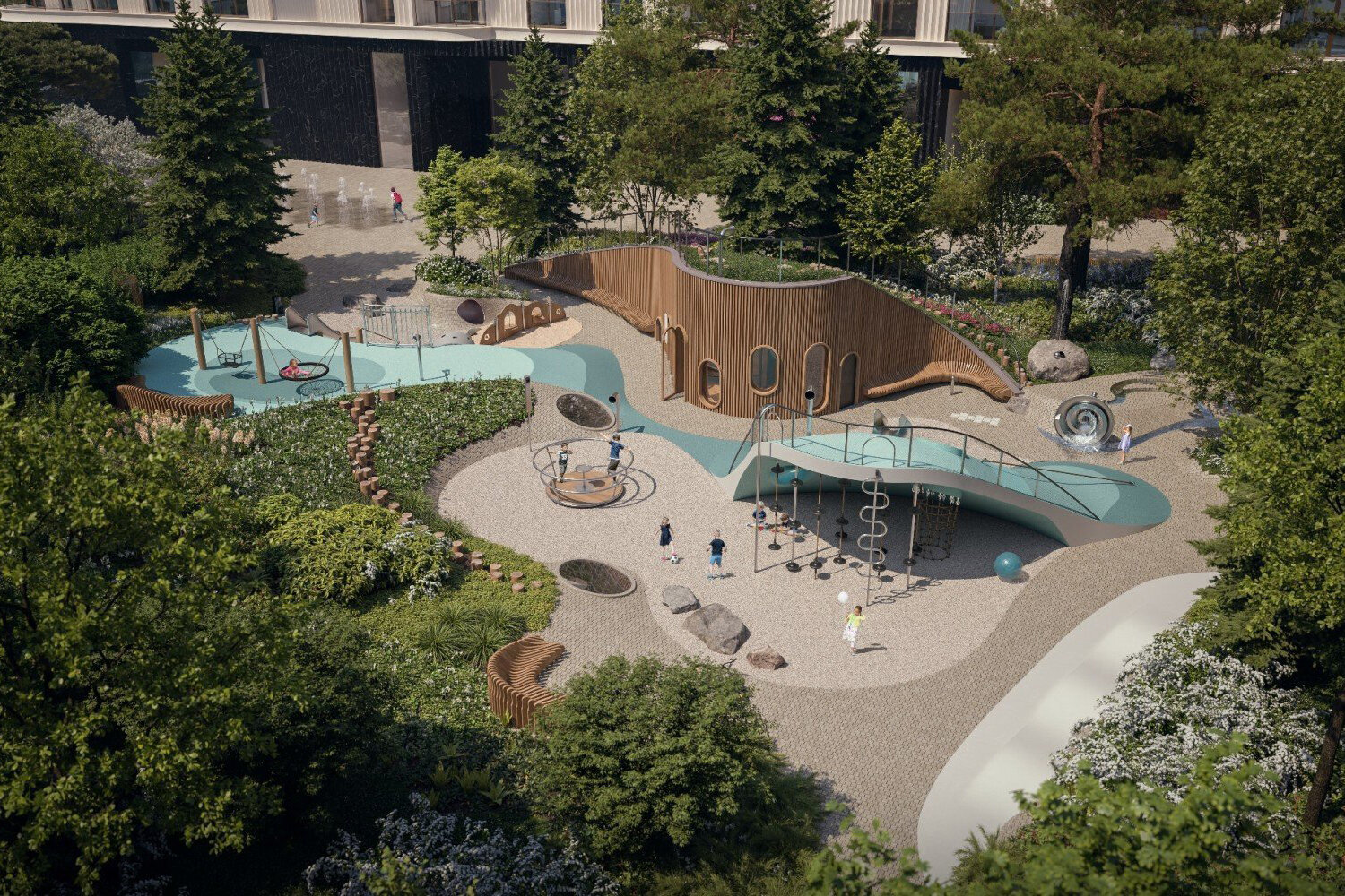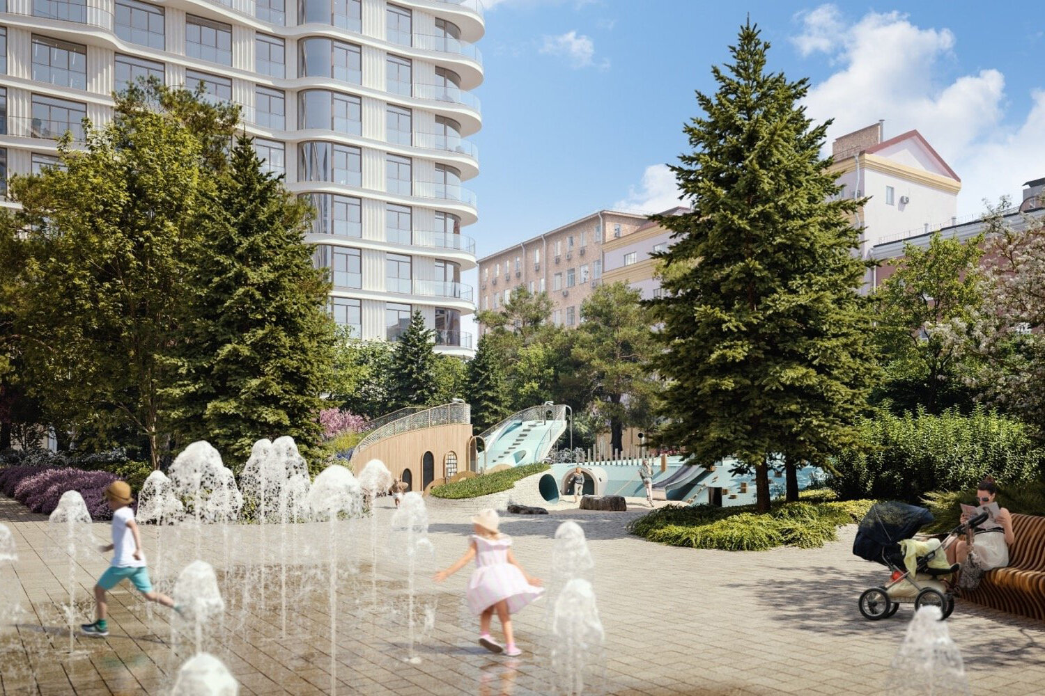 Дворы. Территория комплекса будет закрытой от посторонних и круглосуточно охраняемой. Во дворе появится парк площадью 1,4 га, в нём разместятся детские площадки, фонтан, пруд и мягкие зоны отдыха.