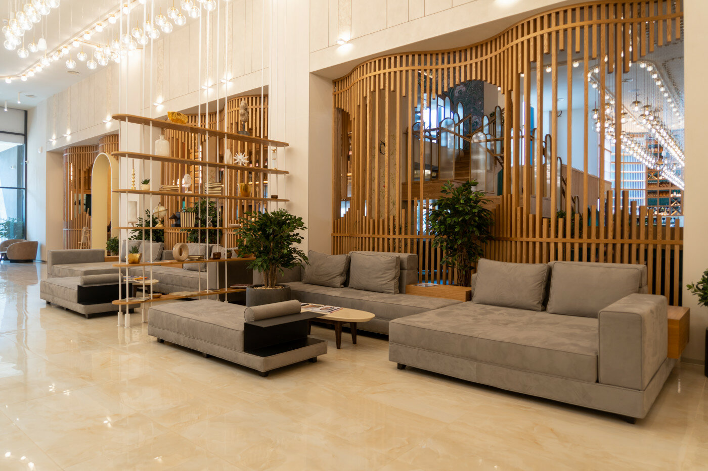 Входные группы. В первой очереди жилого комплекса спроектирована единая входная группа. Здесь расположены стойка ресепшн, зона ожидания с мягкой мебелью и кофе-пойнт.