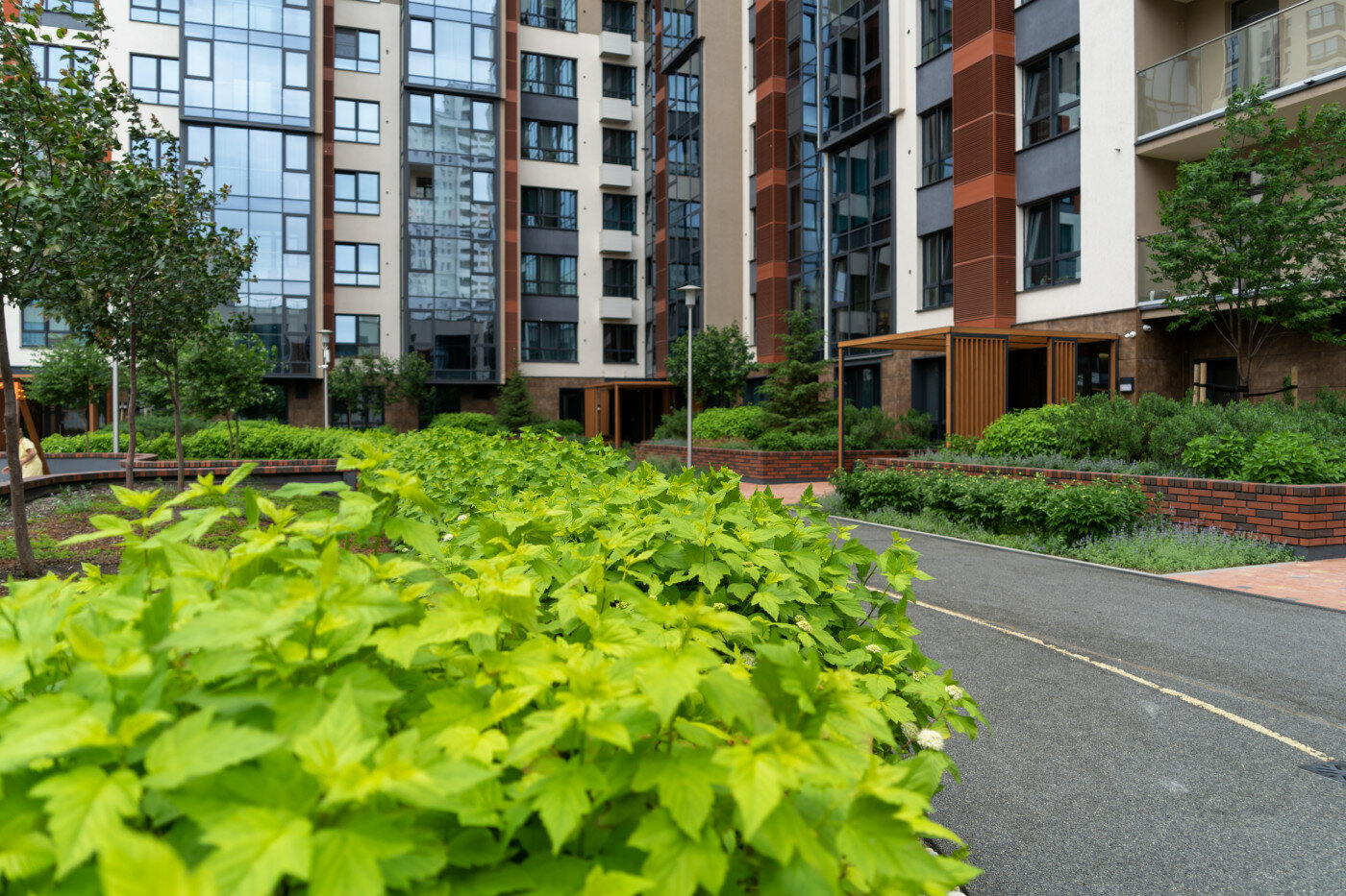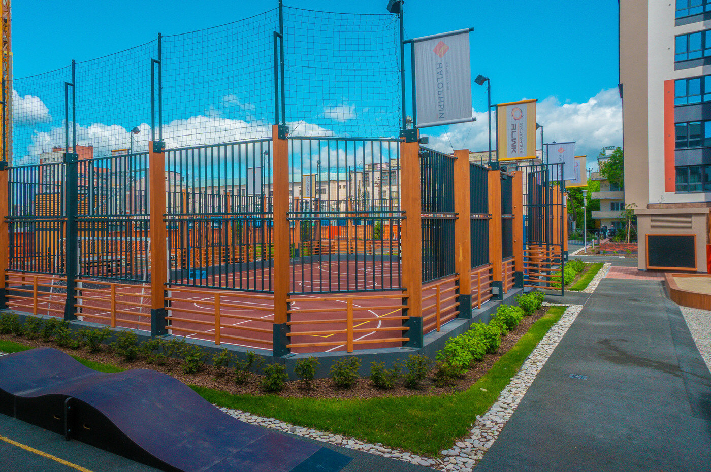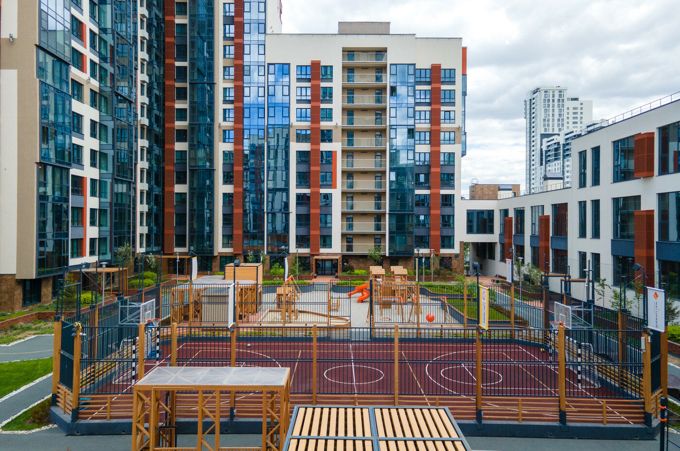 Двор. Проект по благоустройству внутренней территории разработан совместно с компанией Urban Green. Здесь появятся дорожки для катания на роликах, деревянные беседки, спортивные корты и воркаут-зоны. Во дворе будет звучать приятная музыка, во всех зонах будет предусмотрен бесплатный Wi-Fi.
