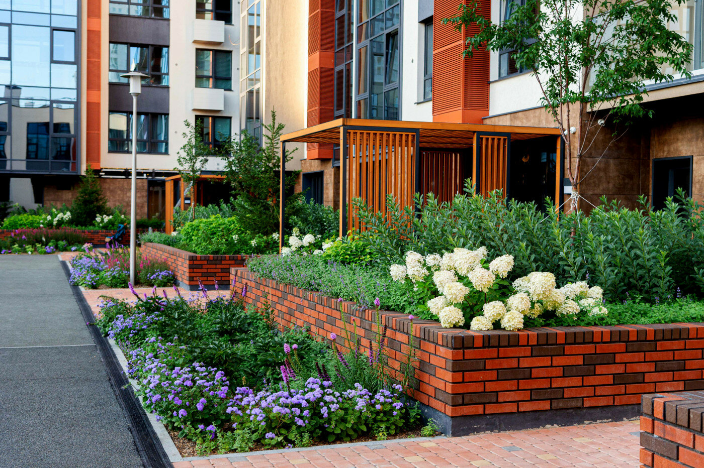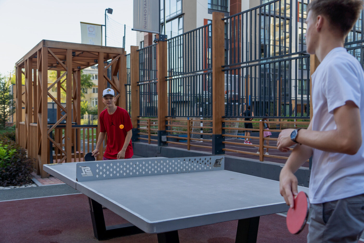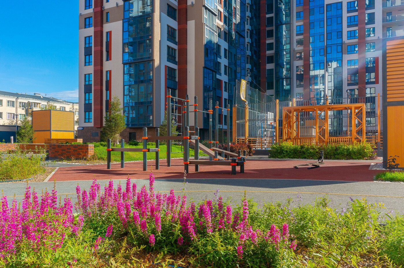 Двор. Проект по благоустройству внутренней территории разработан совместно с компанией Urban Green. Здесь появятся дорожки для катания на роликах, деревянные беседки, спортивные корты и воркаут-зоны. Во дворе будет звучать приятная музыка, во всех зонах будет предусмотрен бесплатный Wi-Fi.