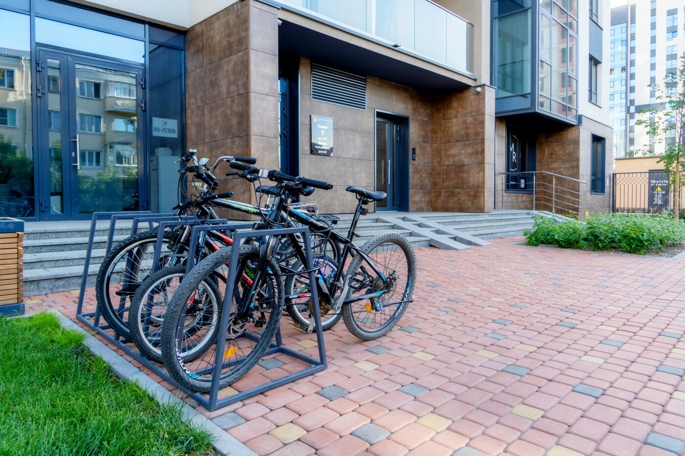 В каждой секции также есть собственные вестибюли. В холлах первых этажей расположены просторные помещения со специальным оборудованием для хранения велосипедов, колясок и спортивного инвентаря. Предусмотрен также душ для домашних питомцев, где можно помыть и высушить лапы.