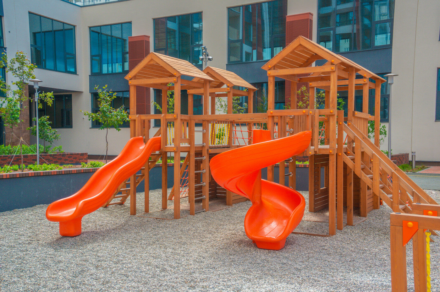 Для детей. Во дворе обустроены детские игровые комплексы из натуральной лиственницы. Покрытие на площадках выполнено из морской гальки.