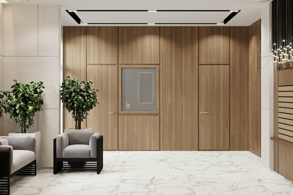 Входные группы. Входы в здания оборудованы системой распознавания лиц, а открыть дверь гостям можно будет с помощью мобильного приложения. Общественная зона будет оборудована мягкой мебелью. В холле предусмотрены специальные помещения, где можно вымыть лапы питомцам после прогулки.