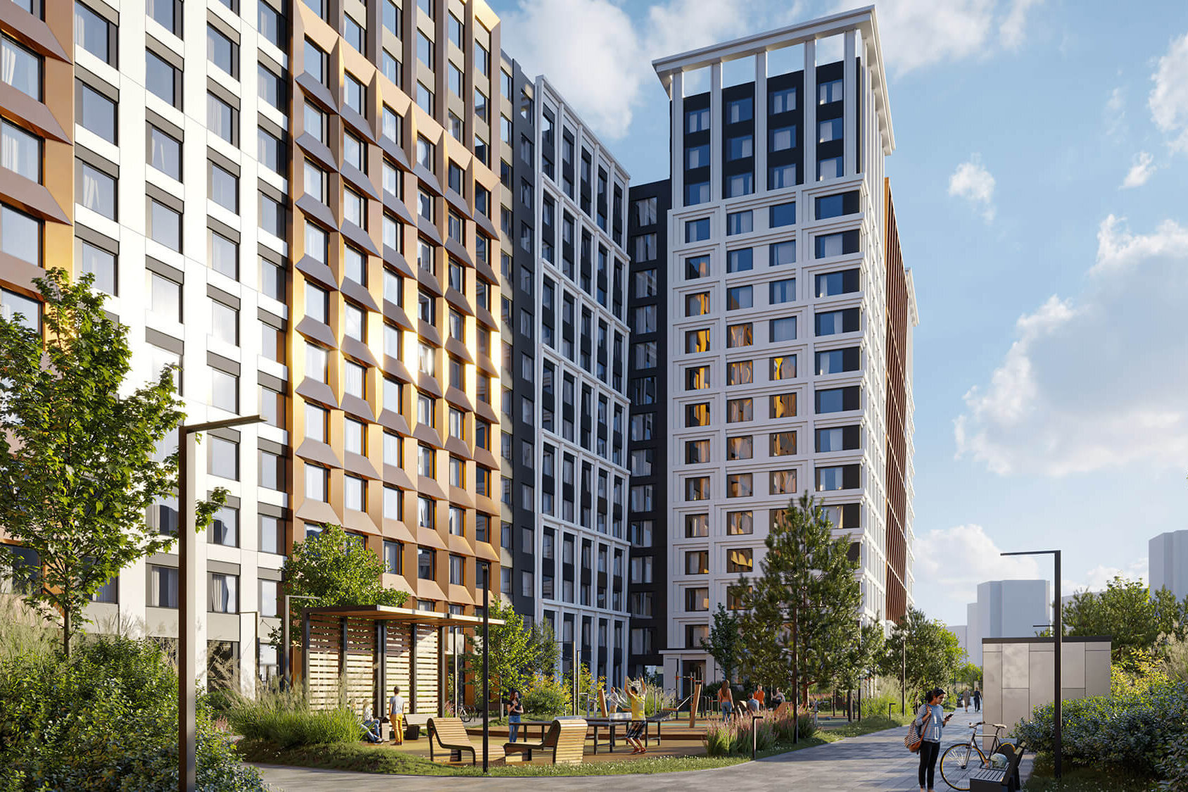 Двор. На территории жилого комплекса оборудуют спортивные и игровые площадки, а также зоны для спокойного отдыха. Кроме того, запланирован зелёный променад.