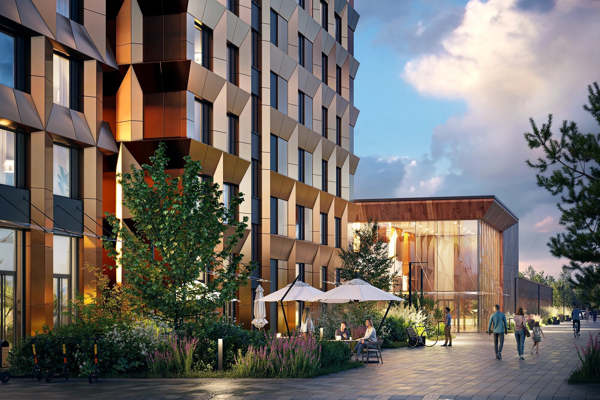 Входные группы. Входы в здание будут расположены на уровне земли, в ЖК спроектированы две двухуровневые входные группы. На первом уровне предусмотрена стойка ресепшн, здесь же будут почтовые ящики и лифты. Второй этаж займут коворкинг, кофе-бар и холл для общения. Здесь выполнят отделку с использованием дерева, это будет контрастировать с внешним фасадом, где преобладает металл.
