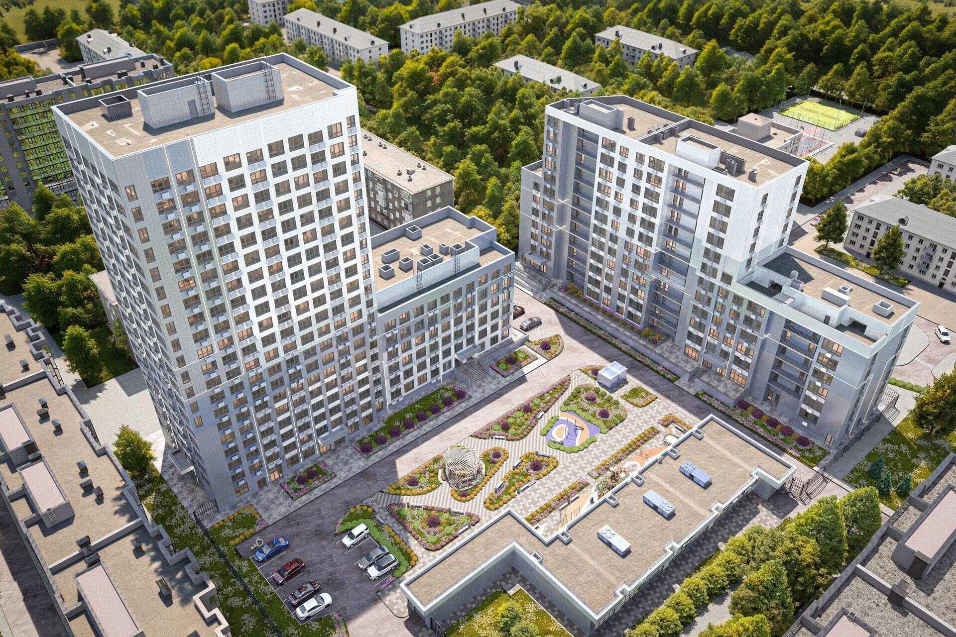 Инфраструктура комплекса включает закрытый двор с озеленением, зонами для отдыха, спорта и игр. На первых этажах разместят холлы с колясочными и стрит-ритейл, на цокольном этаже — паркинг с автоматическим въездом.