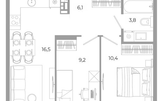 В жилом комплексе представлено 25 планировок от студий до трёхкомнатных. Можно подобрать квартиру с нишей под хранение, дополнительным санузлом, угловым остеклением. Все варианты, кроме студий, имеют кухню-гостиную размером от 14 кв.м. Отличительная особенность проекта — увеличенные площади остекления с отступом от пола 60 см. Балконы в квартирах не предусмотрены.