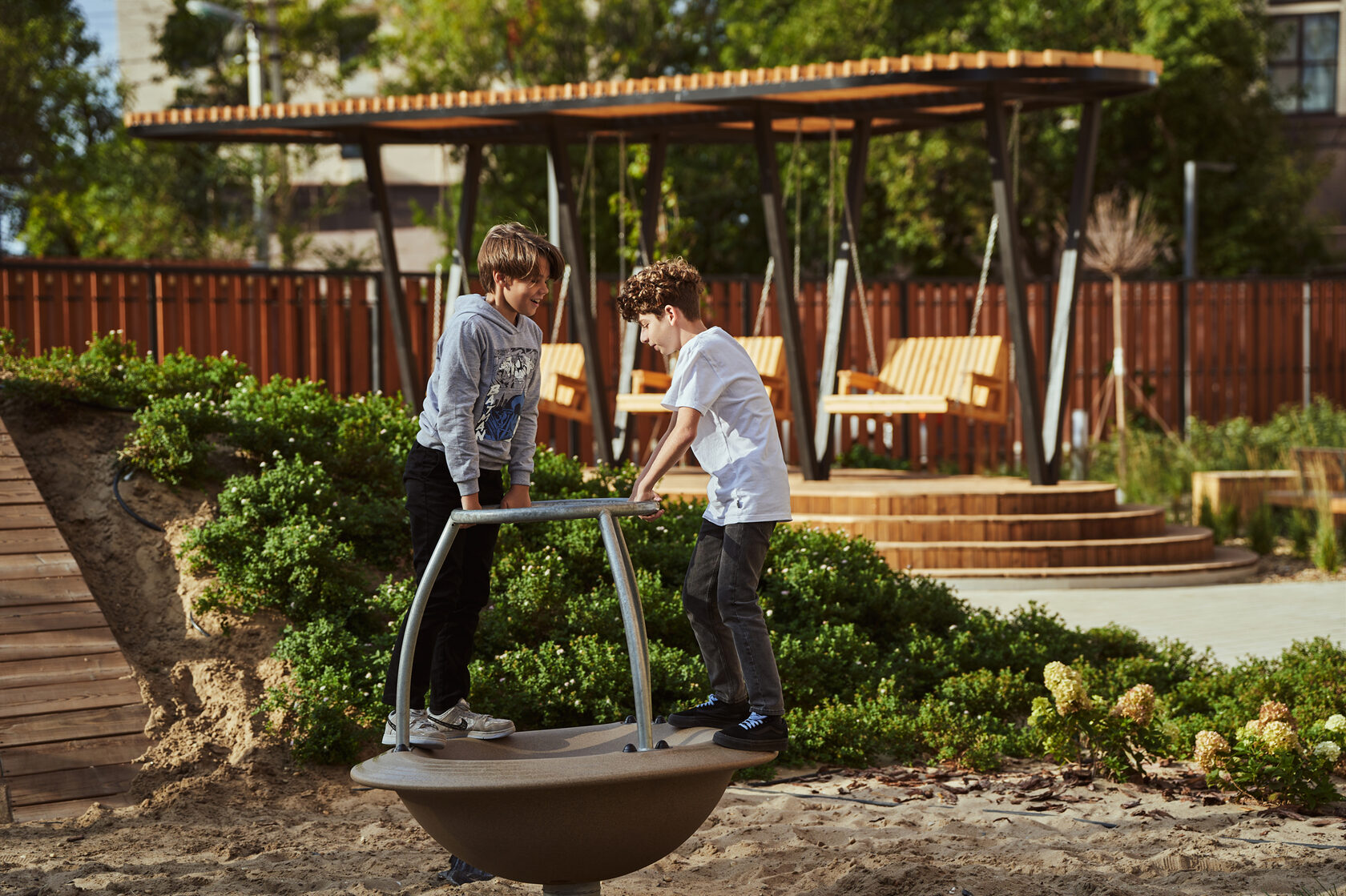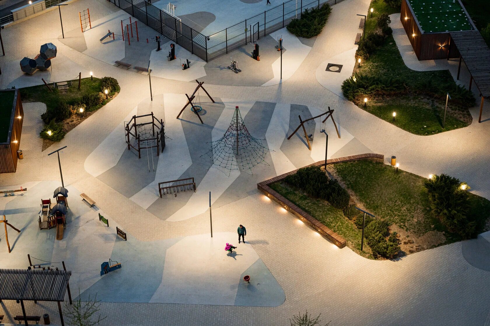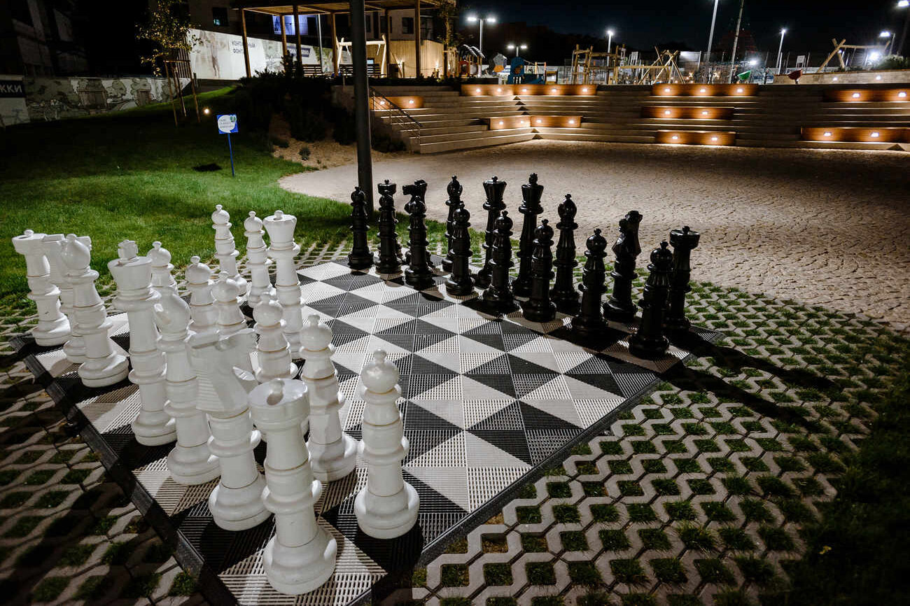 Для детей. Во дворе обустроят детскую площадку из натуральных материалов, которые не замерзают на морозе и не нагреваются на солнце. Также предусмотрены нестандартные игровые зоны — ростовые шахматы и тарзанка.