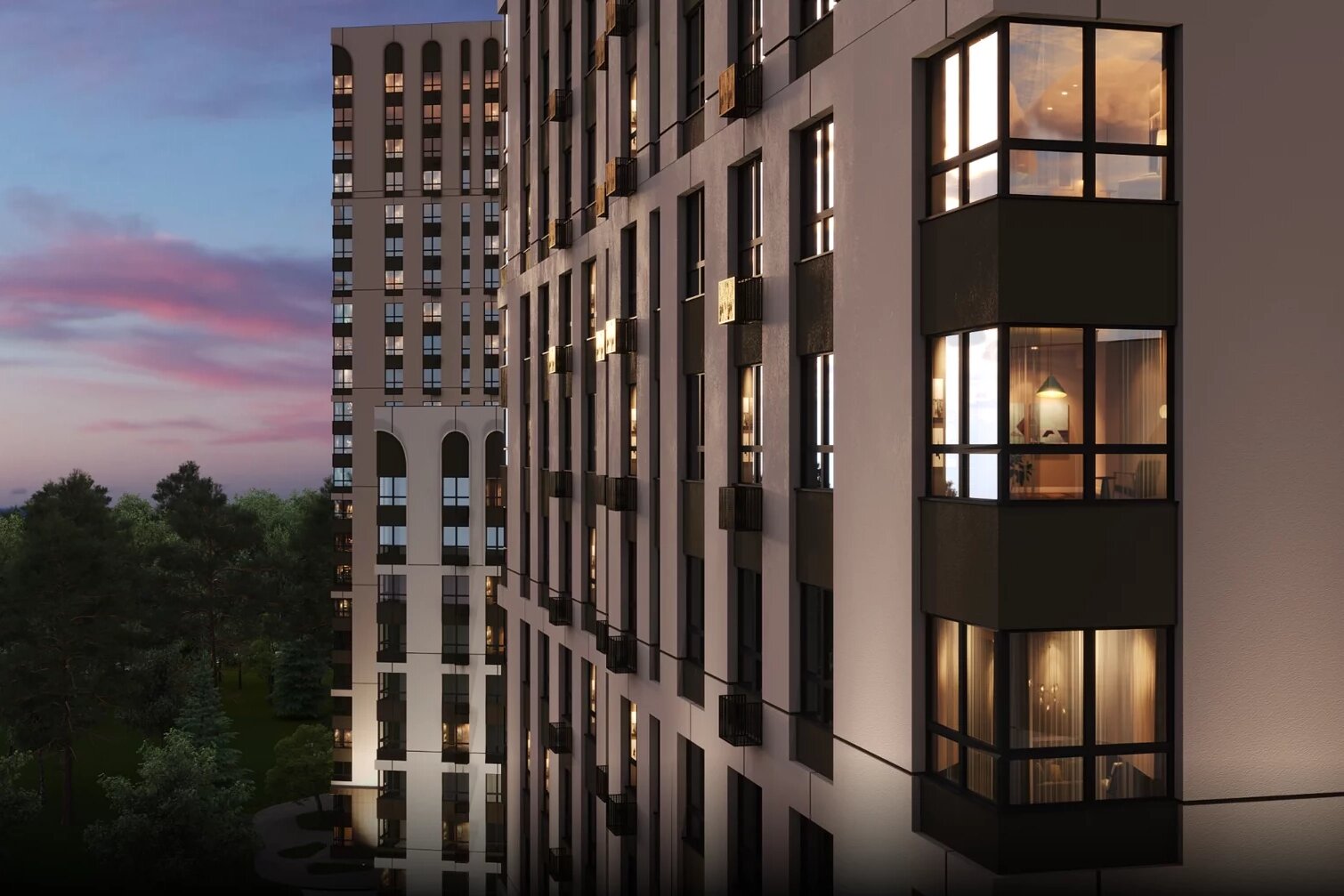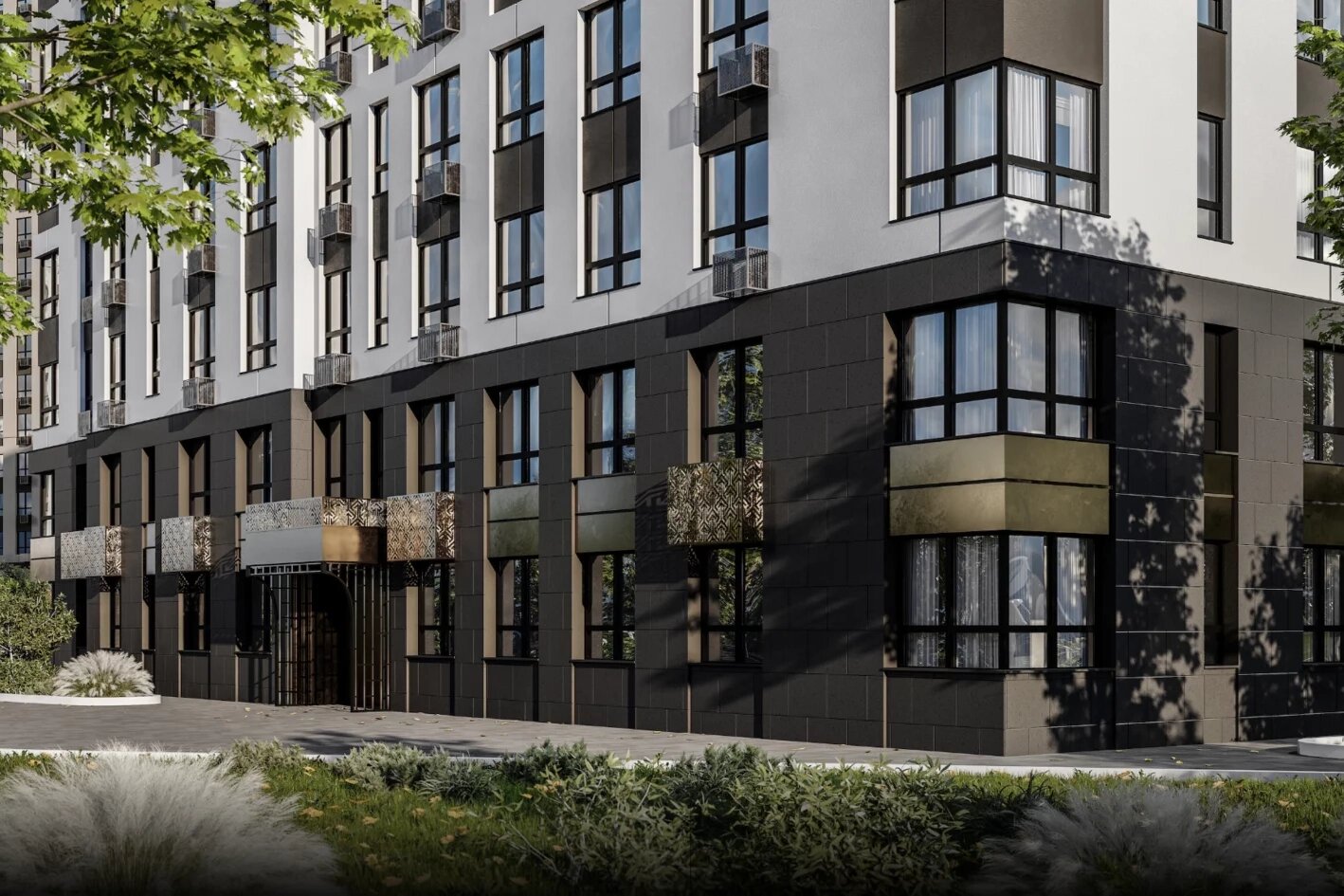 Первые два этажа в домах облицованы жидким камнем. На фасадах выше — композитные панели латунного цвета. Оконные рамы выполнены в графитовом цвете и не выбиваются из общего архитектурного стиля. Арки придают домам выразительности.