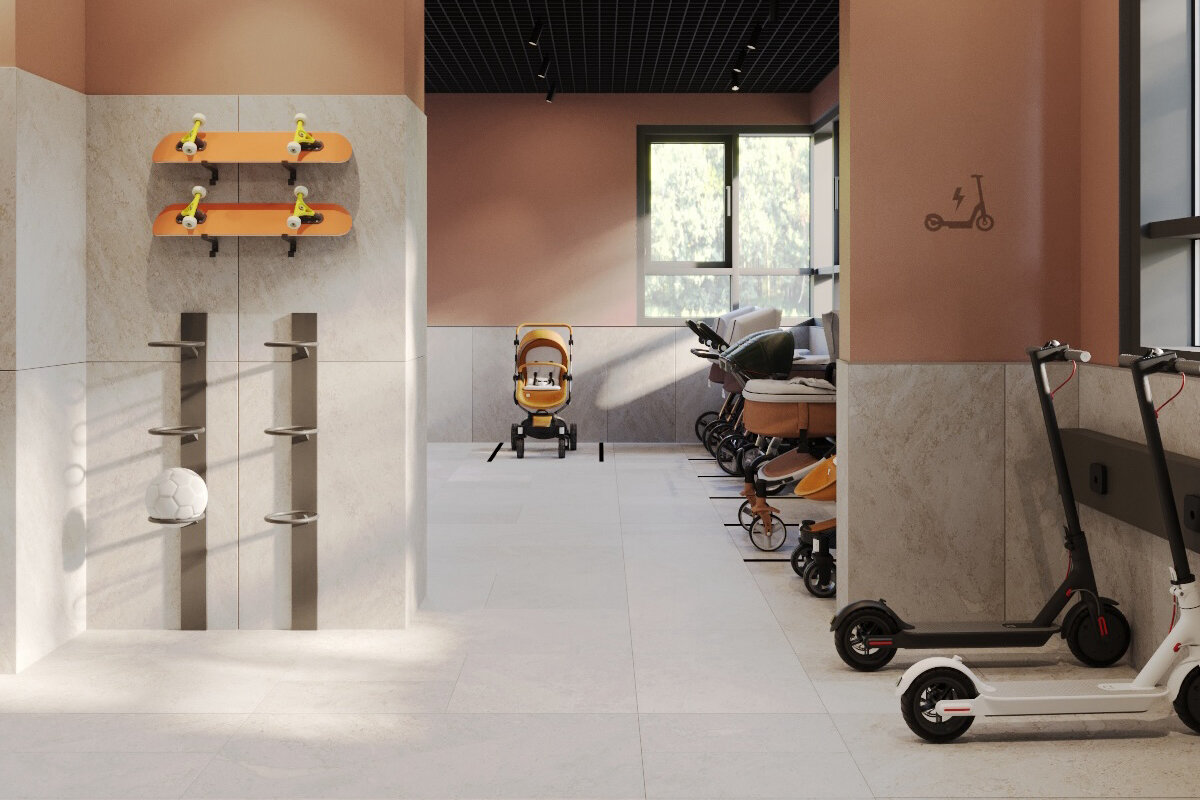 На первом этаже расположена просторная охраняемая колясочная с выходом во двор, на -1 этаже предусмотрено пространство для хранения велосипедов. В домах установлены по три бесшумных скоростных лифта KOYO.