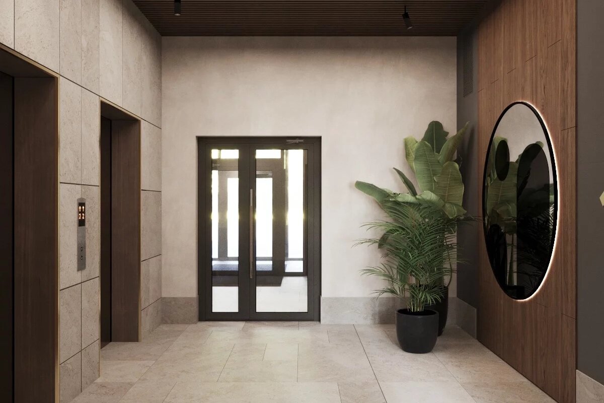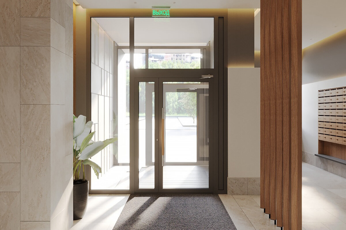 Входные группы. Подъезды имеют безбарьерный вход, для удобного прохода жителей с колясками, велосипедами и чемоданами. Высота потолков в лобби — 3,7 метра, здесь также разместятся мягкие зоны ожидания. По периметру комплекса и в подъездных холлах установлено видеонаблюдение.