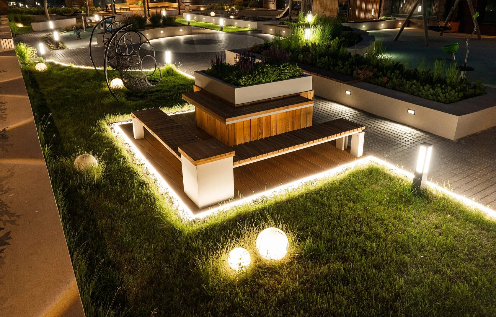Двор. Территория двора разделена на функциональные зоны для отдыха, общения и спорта. Выделена также зона с городскими грядками, на которых можно выращивать зелень. Также здесь появятся водные конструкции, бесплатный Wi-Fi и многоуровневое освещение. Озеленение займёт 60% площади двора.