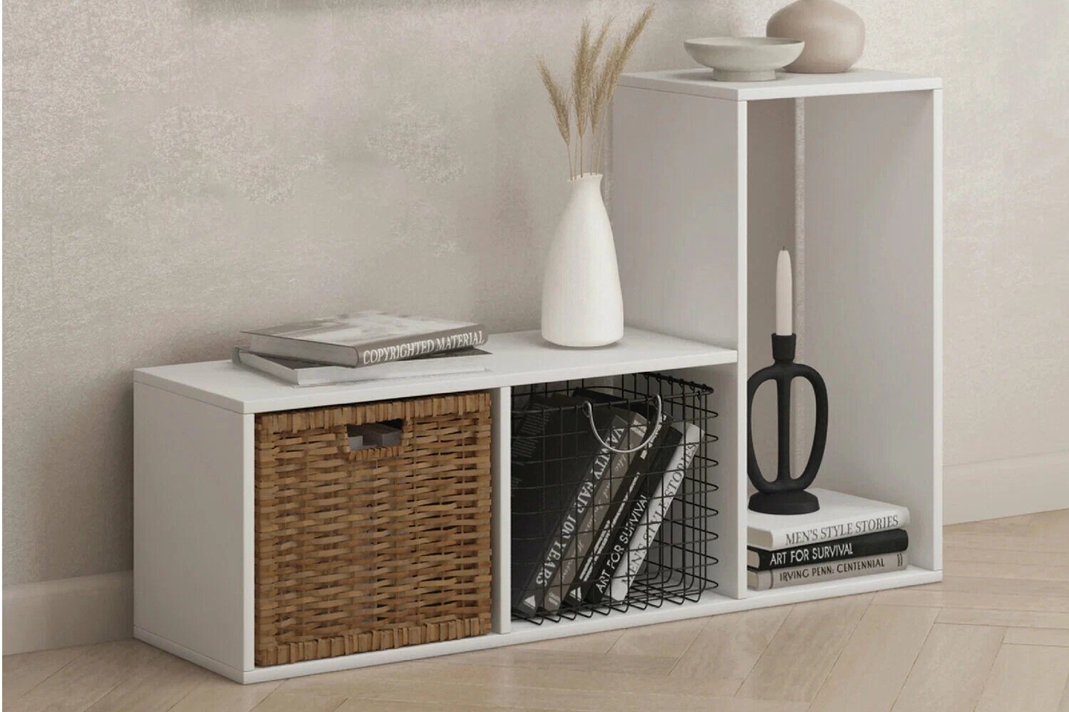 Шкафы и стеллажи тоже перестали быть константой: базовый каркас можно дополнить полками, ящиками или дверцами — или, наоборот, оставить всё открытым. В итоге один и тот же стеллаж легко превращается то в свободную витрину, то в закрытый шкаф.