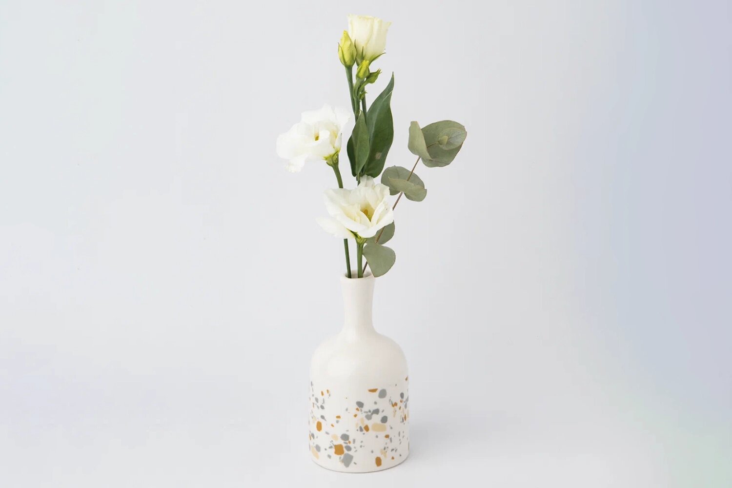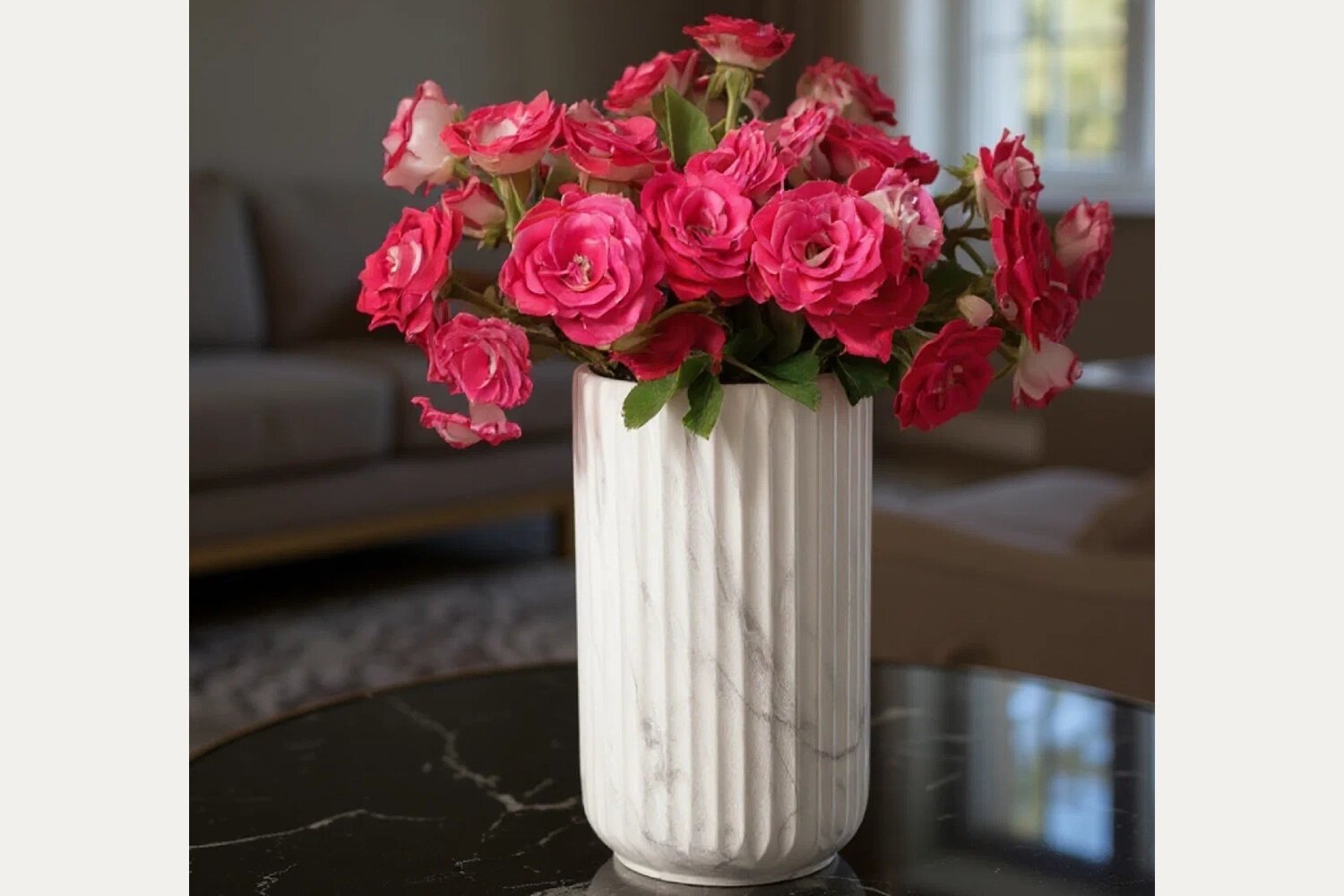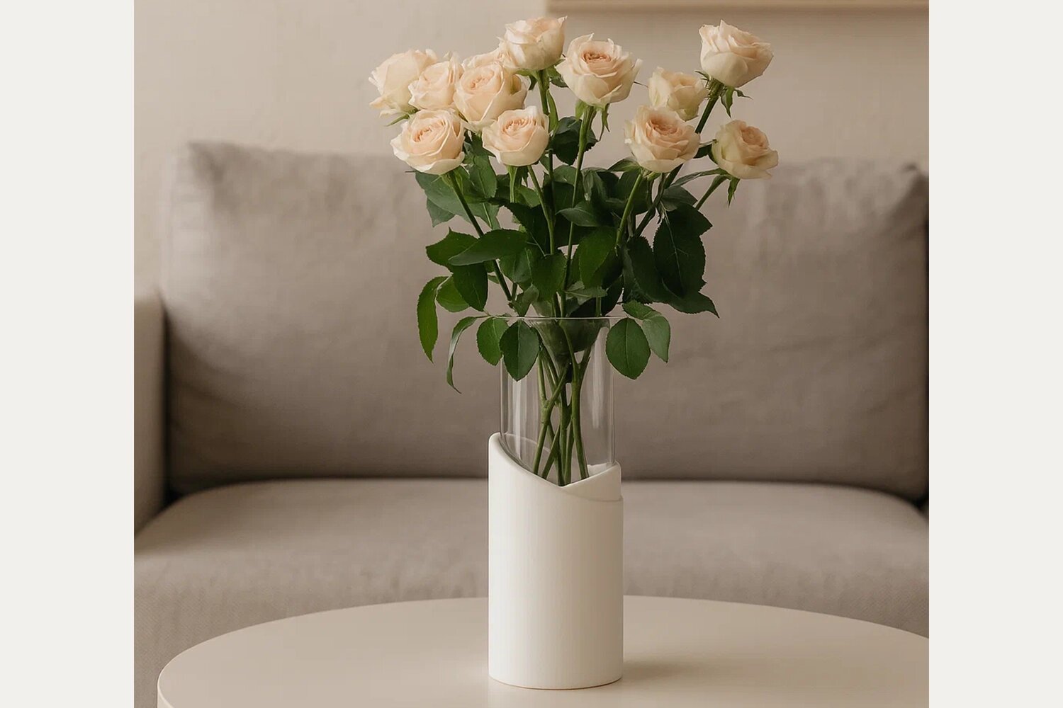 Белая матовая керамика, фактурные сосуды, полупрозрачное стекло — Cloud Dancer красиво подчеркивает форму предмета.Подойдут: вазы из матового фарфора, бутылочные формы, гипс с ребристой фактурой.