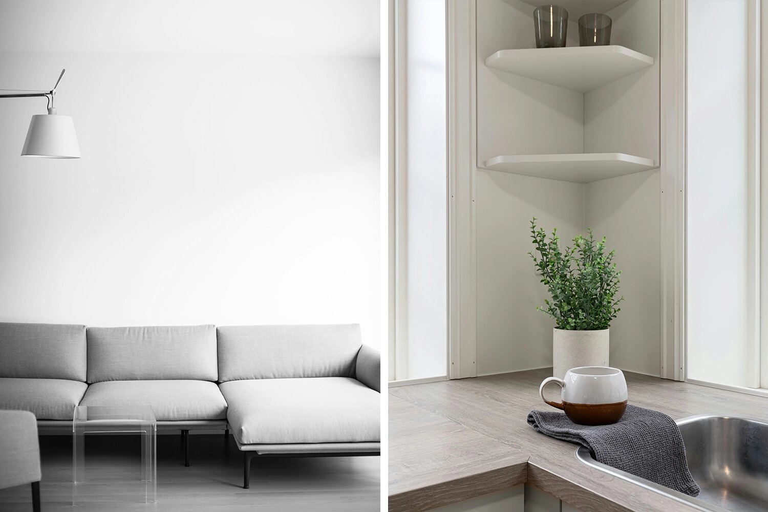 Такой нейтральный белый в ванной в сочетании с природными текстурами создаёт ассоциации со спа. На кухне — даёт больше цвета и привносит ощущение простора даже в маленьком помещении.