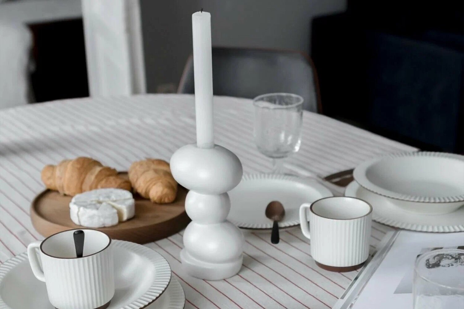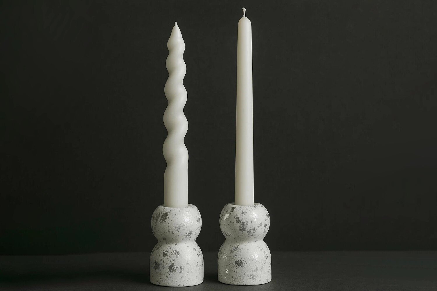 Металл, дерево, молочное стекло — мягкий белый работает с любым материалом.Подойдут: тонкие металлические подсвечники, канделябры из светлого дерева, стеклянные цилиндры.