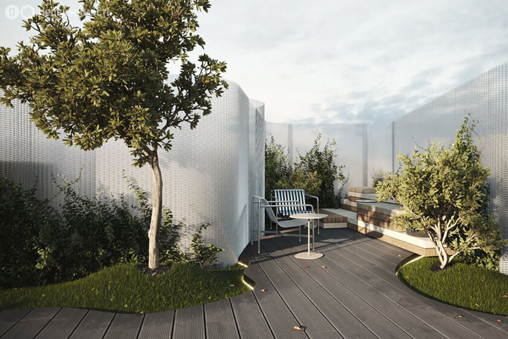 Двор. Во внутреннем дворе-патио будет организован амфитеатр и оборудованы зоны для отдыха и велопарковки. Дополнительное общественное пространство разместится на террасе на крыше здания. Здесь появятся зоны для отдыха с лежаками, зона для барбекю, летний кинотеатр и фонтан.