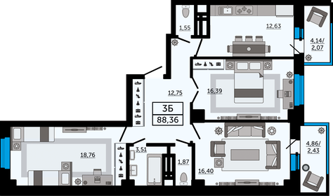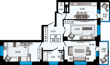 Трёхкомнатные квартиры площадью от 73,1 кв. м. В них по три изолированные комнаты, по два санузла, балконы. Есть планировки с гардеробными комнатами.