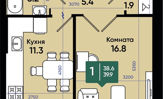 Однокомнатные площадью от 32,2 до 37,2 кв. м. В них совмещённые санузлы, лоджии.