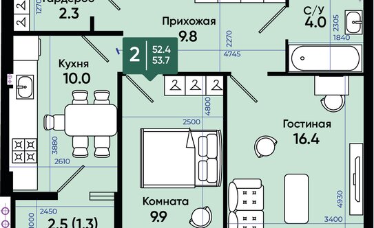 Двухкомнатные площадью от 49,8 до 60,4 кв. м. В них по две изолированные комнаты, лоджии, по одному или два санузла. Есть варианты с гардеробными комнатами.