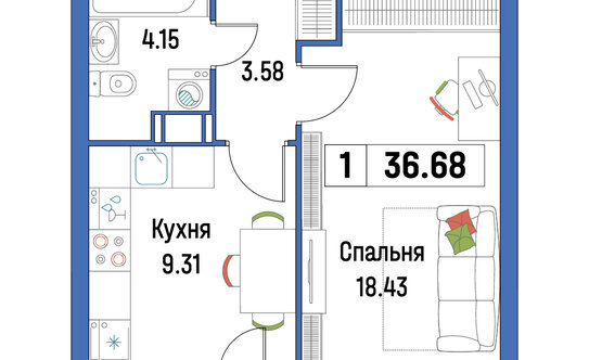 Однокомнатные квартиры площадью от 34,3 до 41,5 кв. м. В квартирах простые планировки, совмещённые санузлы, балконы, гардеробные комнаты.