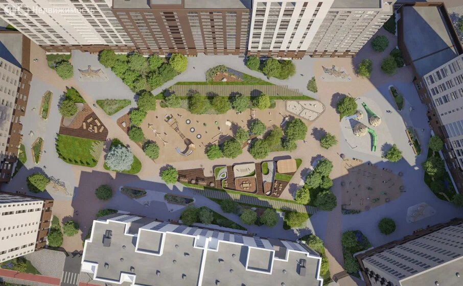 Двор. Внутренние дворы свободны от машин и благоустроены как мини-парки. Здесь используется разновысотный ландшафт, естественные природные материалы и большой объём озеленения. Во дворах есть зонирование для спокойного и активного отдыха: зона тренажёров для взрослых, место занятий йогой, велоремонтная станция, скамейки и качели.