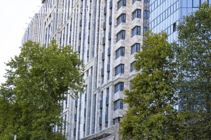 Фасады будут отделаны натуральным камнем, на крышах появятся декоративные элементы. В отделке используют материалы серых и бежевых оттенков. Ещё одна особенность комплекса — большая площадь остекления.
