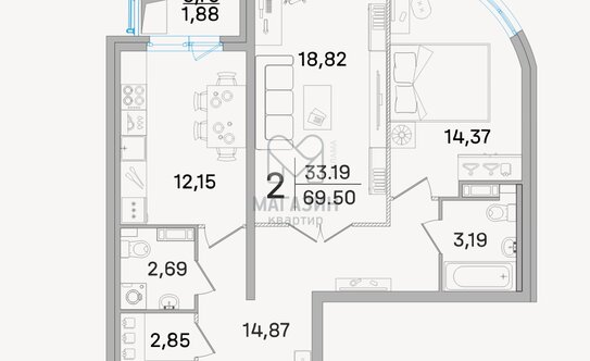 Двухкомнатные квартиры площадью от 69,90 до 74,15 кв. м. В квартирах по две изолированные комнаты, по два санузла, просторные кухни, гардеробные комнаты и балконы.