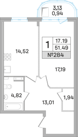 Однокомнатные квартиры площадью от 38,04 до 55,73 кв. м. В них совмещённые санузлы, просторные кухни, застеклённые балконы, в некоторых комнатах скруглённые стены. Есть планировки с гардеробными комнатами.