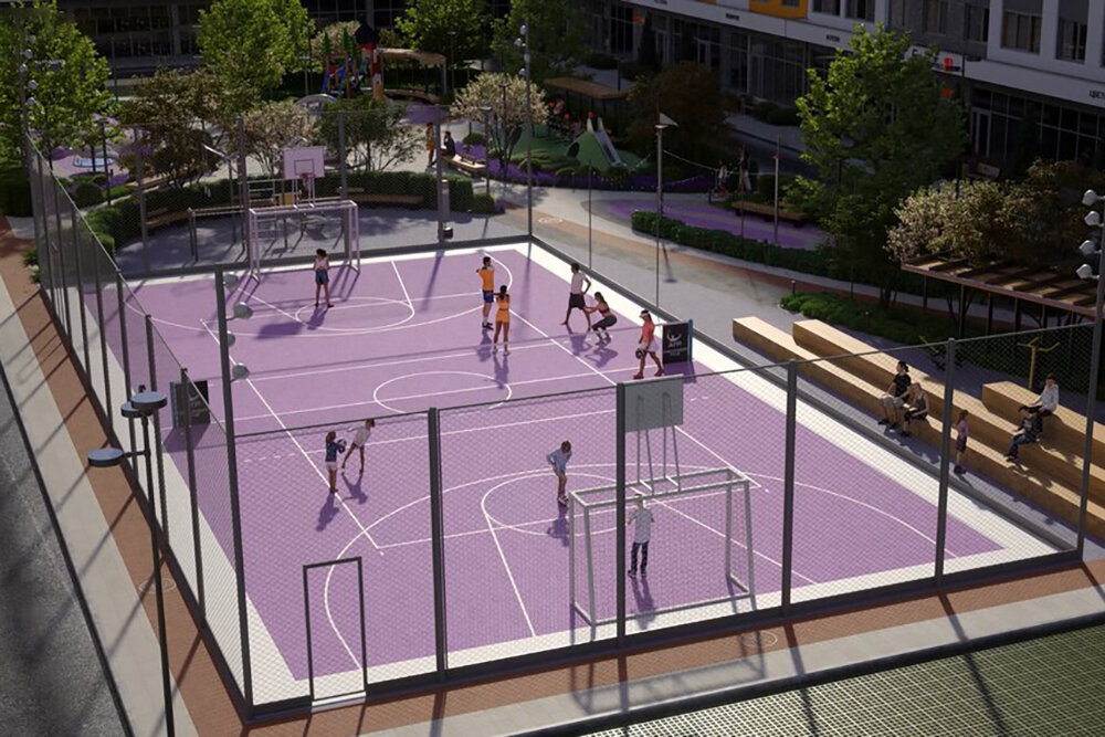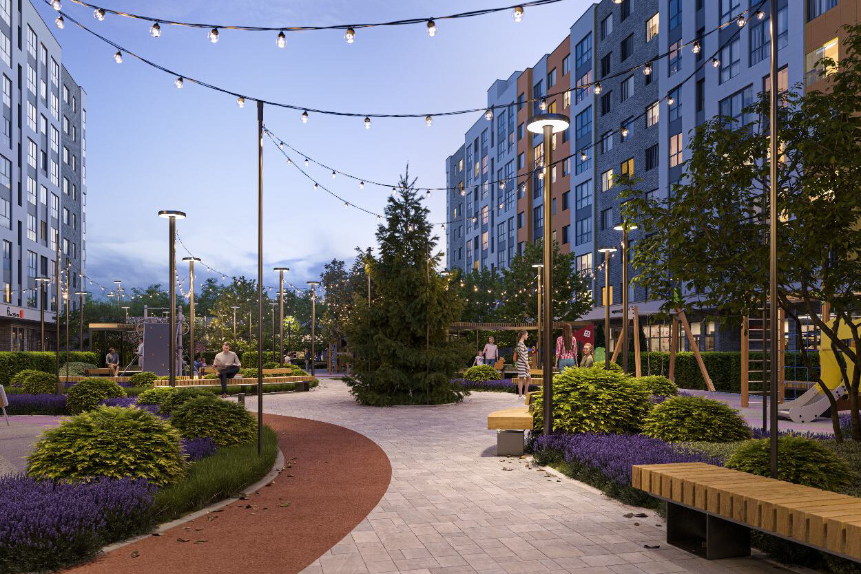 Дворы. В ЖК будут благоустроенные дворы с прогулочными дорожками, беседками, детскими площадками, полем для игровых видов спорта.